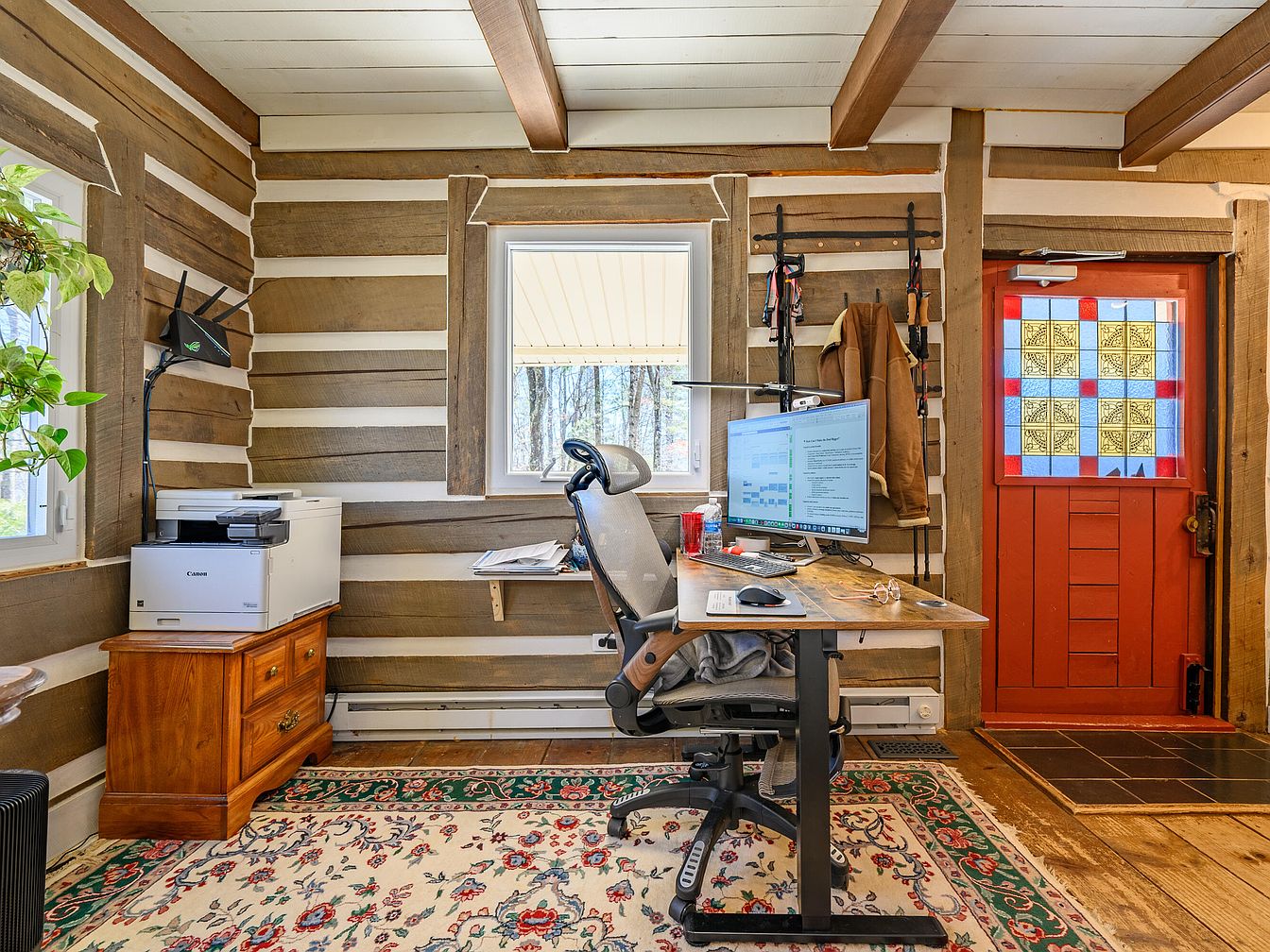 The home office features rustic wooden walls with alternating light and dark planks, creating a warm, inviting atmosphere. Natural light floods in through two windows, highlighting the beige and brown tones. A wooden desk, with an ergonomic chair, accommodates modern technology, including a sleek monitor and printer. An ornate area rug, displaying floral patterns in muted colors, adds comfort underfoot. Beside the desk, a wooden cabinet provides storage, while a coat is casually hung on a wall-mounted rack. A vibrant red door, with stained glass accents, serves as a striking focal point, enhancing the room’s character.