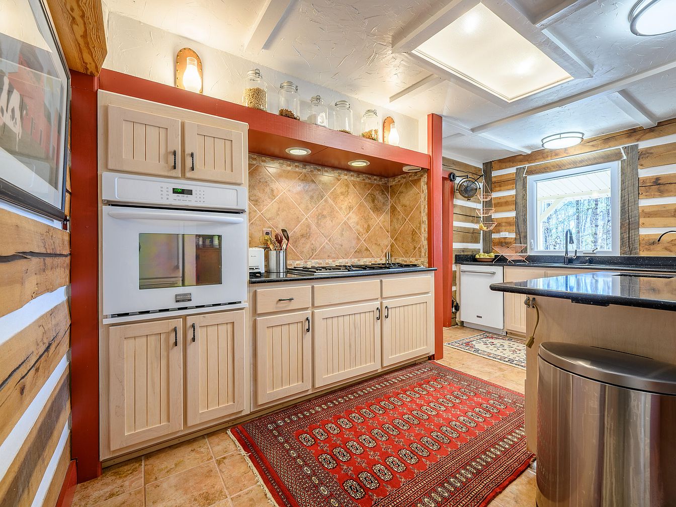 This kitchen features a blend of rustic and modern aesthetics. The walls showcase natural wood logs alongside a bold red accent, enhancing warmth. Light-colored wooden cabinets with textured fronts provide ample storage, complemented by a sleek black countertop. A tiled backsplash in earthy tones adds depth and visual interest. The stainless-steel appliances and fixtures introduce a contemporary touch. Illuminated by recessed lighting and a glowing ceiling fixture, the space is inviting. A vibrant red area rug underpins the cozy atmosphere, while a large window invites natural light, offering a view of the outdoors and greenery.