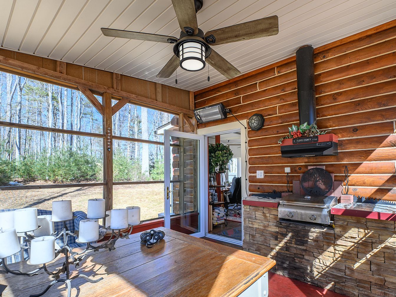 This screened porch features a rustic ambiance with wood-paneled walls and exposed logs, merging indoor comfort with outdoor views. Natural light floods in through expansive screens, revealing a backdrop of trees. A large wooden table stands at the center, accompanied by a decorative candelabra. A stone grill and countertop area are built into one side, enhancing the space’s functionality for outdoor cooking. Above, a modern ceiling fan provides airflow, while simple light fixtures add charm. The red-stained floor complements the earthy tones, creating a warm, inviting space ideal for relaxation and entertainment.