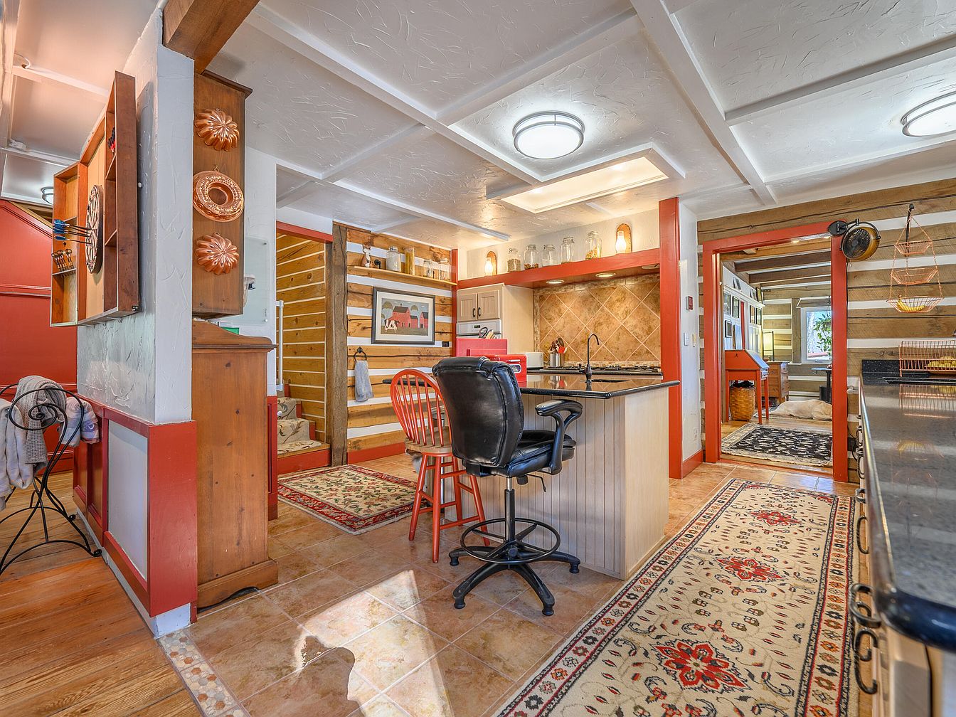 This kitchen area features a warm, inviting layout with a blend of rustic and contemporary elements. The color scheme combines deep reds and soft earth tones, enhancing the cozy atmosphere. A central island showcases a dark countertop, complemented by red-patterned stools adding a pop of color. Exposed beams and wood paneling reveal the home’s historical character. Bright light fixtures illuminate the workspace, while shelves display curated items, adding personality. The adjoining doorway leads to a quaint living area, framed by wooden accents. Decorative rugs unify the space, offering texture and warmth, reflecting a love for design.