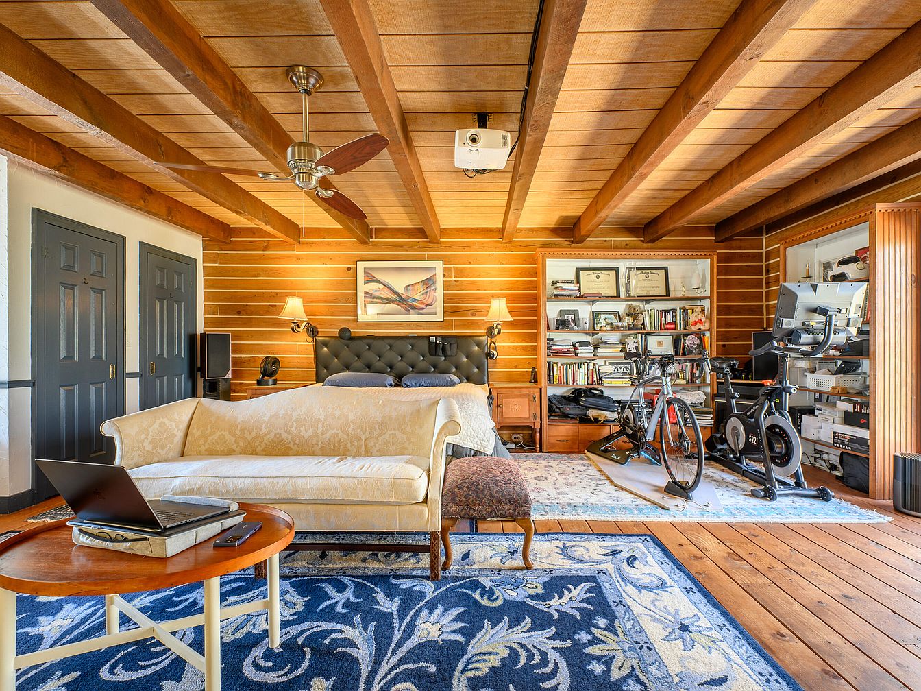 This cozy bedroom blends vintage charm with modern functionality. Warm wood beams crisscross the ceiling, complementing the rich wooden floors. The centerpiece is a tufted black headboard framing a neatly made bed, flanked by elegant wall sconces. A light-colored, ornate sofa sits across from a stylish wooden table, which holds a laptop and several personal items. Two doors lead to potential storage areas, while a shelf filled with books and personal mementos adds character. Fitness equipment occupies one corner, revealing a blend of lifestyle choices within an inviting atmosphere. The decor balances comfort and practicality expertly.