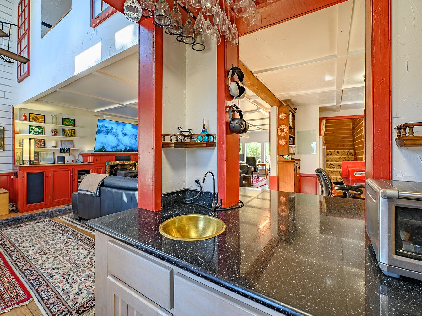 The space showcases an open concept kitchen seamlessly integrated with the living area. A striking black granite countertop features a unique gold sink, enhancing visual contrast. Behind the counter, bold red wooden pillars support the structure, while a rustic wooden shelf displays decorative ceramics. The living area is anchored by a large black leather sofa, with a warm, colorful Persian-style rug beneath. Above, natural light floods through tall windows, illuminating vibrant artwork on the wall. The warm wood tones of the staircase and surrounding furniture add coziness to this inviting communal space.
