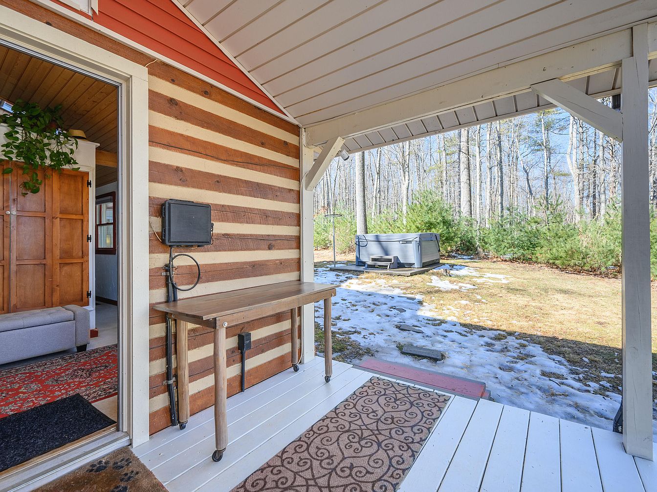 A quaint front porch features natural wood tones from log siding, emphasizing rustic charm. A pair of vibrant, colorful chairs—one red and one green—contrast with the warm brown hues of the wooden structure. A small, round black table stands between them, inviting relaxed conversations. The slatted ceiling and vertical beams enhance the vertical lines while allowing natural light to filter through. Surrounding lush trees create a serene backdrop, emphasizing a connection with nature. The flooring is painted in a light shade, complementing the darker wood tones and contributing to a bright, welcoming atmosphere, perfect for enjoying morning coffee.