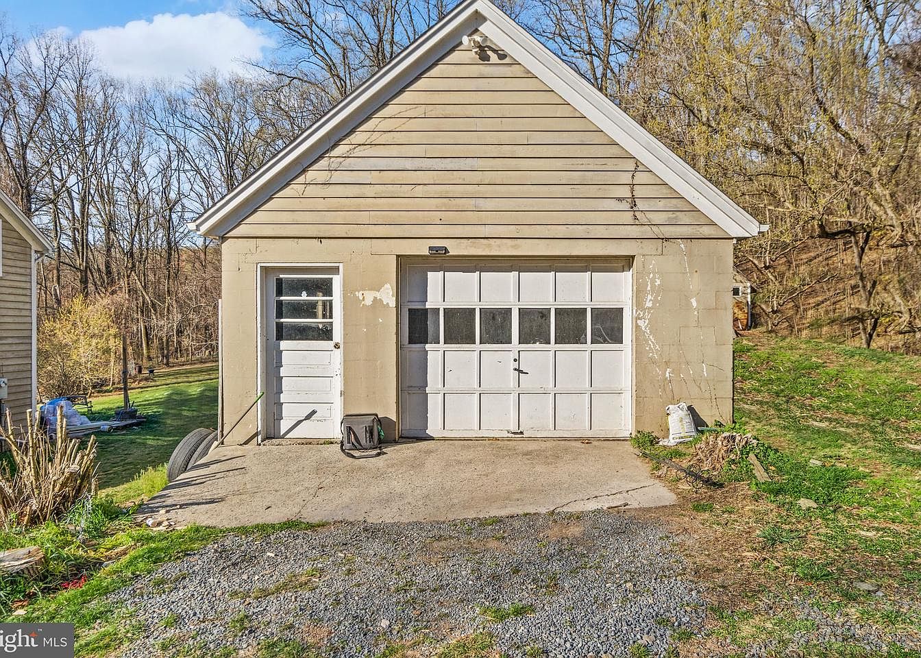This garage shows a simple yet functional exterior, characterized by a blend of horizontal wooden siding painted in beige. The front features a large, multi-panel garage door with a classic design, allowing for easy access to the space. Adjacent to the garage door is a smaller service door with glass panels for a vintage touch. The concrete driveway provides a sturdy entrance, with a mix of gravel and grass surrounding it, enhancing the rustic aesthetic. The building is framed by trees in the background, integrating it into the natural setting, while remnants of nature’s greens add a quaint charm to the overall look.