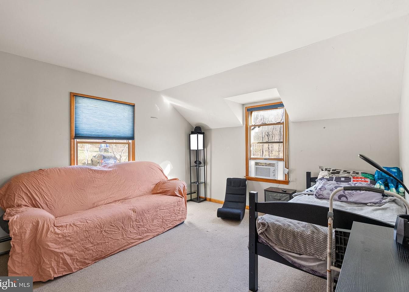 A cozy bedroom featuring a blend of practicality and comfort. The soft shades of gray walls complement the light beige carpet, creating a warm ambiance. A pink-covered sofa occupies one corner, adding a splash of color, while a sleek black floor lamp stands nearby. Sunlight streams through two windows adorned with blue blinds, illuminating the space. An air conditioning unit peeks through the window, ensuring comfort during warmer months. A neatly made bed with decorative pillows and a small black nightstand adds function. The room’s slanted ceiling enhances its charm, offering a snug, intimate feel.