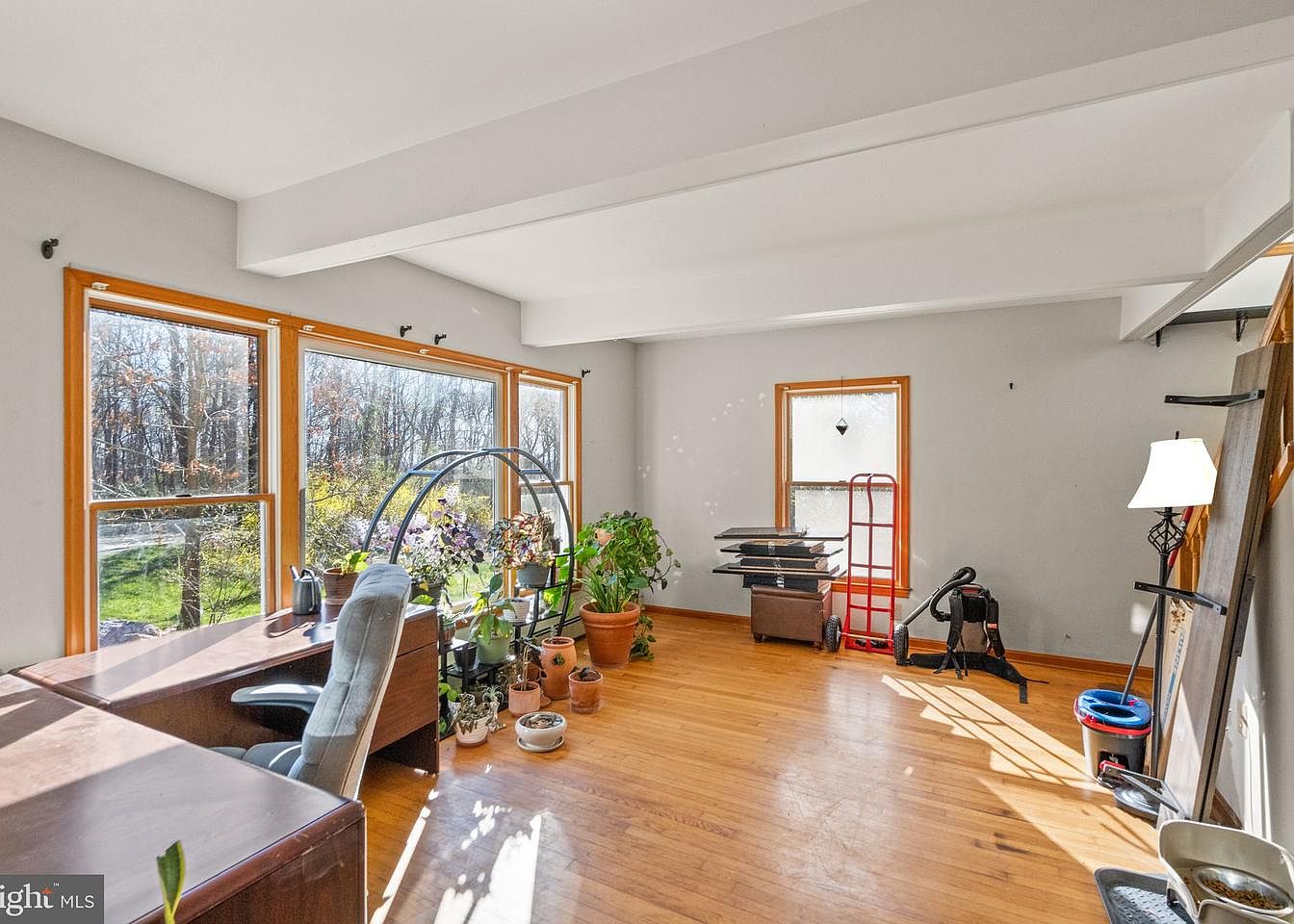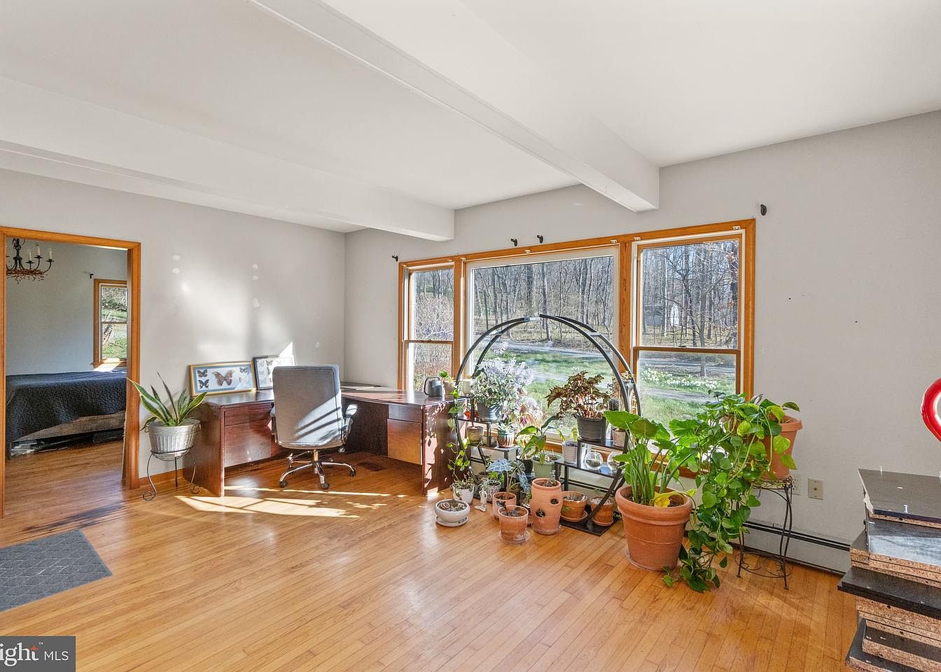The space features a warm, inviting home office with large windows allowing natural light to fill the room. Wooden floors create a cozy atmosphere, complemented by light gray walls. A sleek wooden desk, paired with an ergonomic chair, sits next to an array of lush houseplants on a black shelf, adding a touch of greenery. The room’s layout promotes a seamless flow to a nearby bedroom area. Additionally, the ceiling showcases exposed beams for a rustic charm, elevated by the soft shadows created by sunlight streaming through the windows, enhancing the tranquil ambiance.