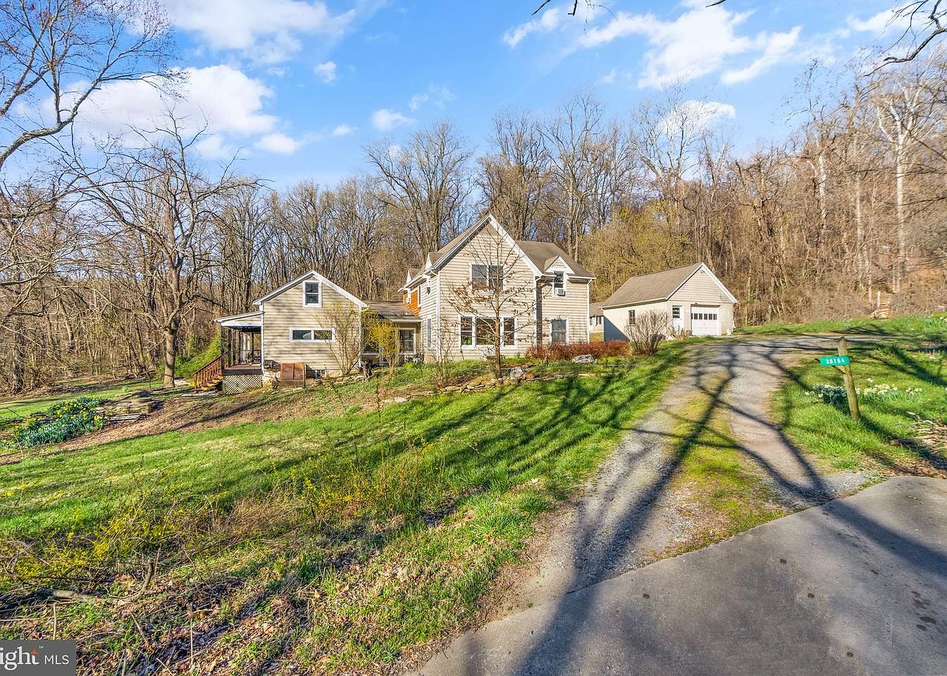 A charming historic American home with a gabled roof and light beige siding is set against a backdrop of wooded terrain. The exterior features multiple sections, including a cozy porch with wooden steps leading up to an inviting entrance. The yard is lush green, dotted with open spaces and patches of flowers, enhancing the natural beauty. The driveway is gravel, winding gently towards a detached garage on the right, framed by well-maintained shrubs. Sunlight filters through a partially cloudy sky, casting soft shadows across the landscape, creating a warm, serene atmosphere that invites relaxation and connection with nature.