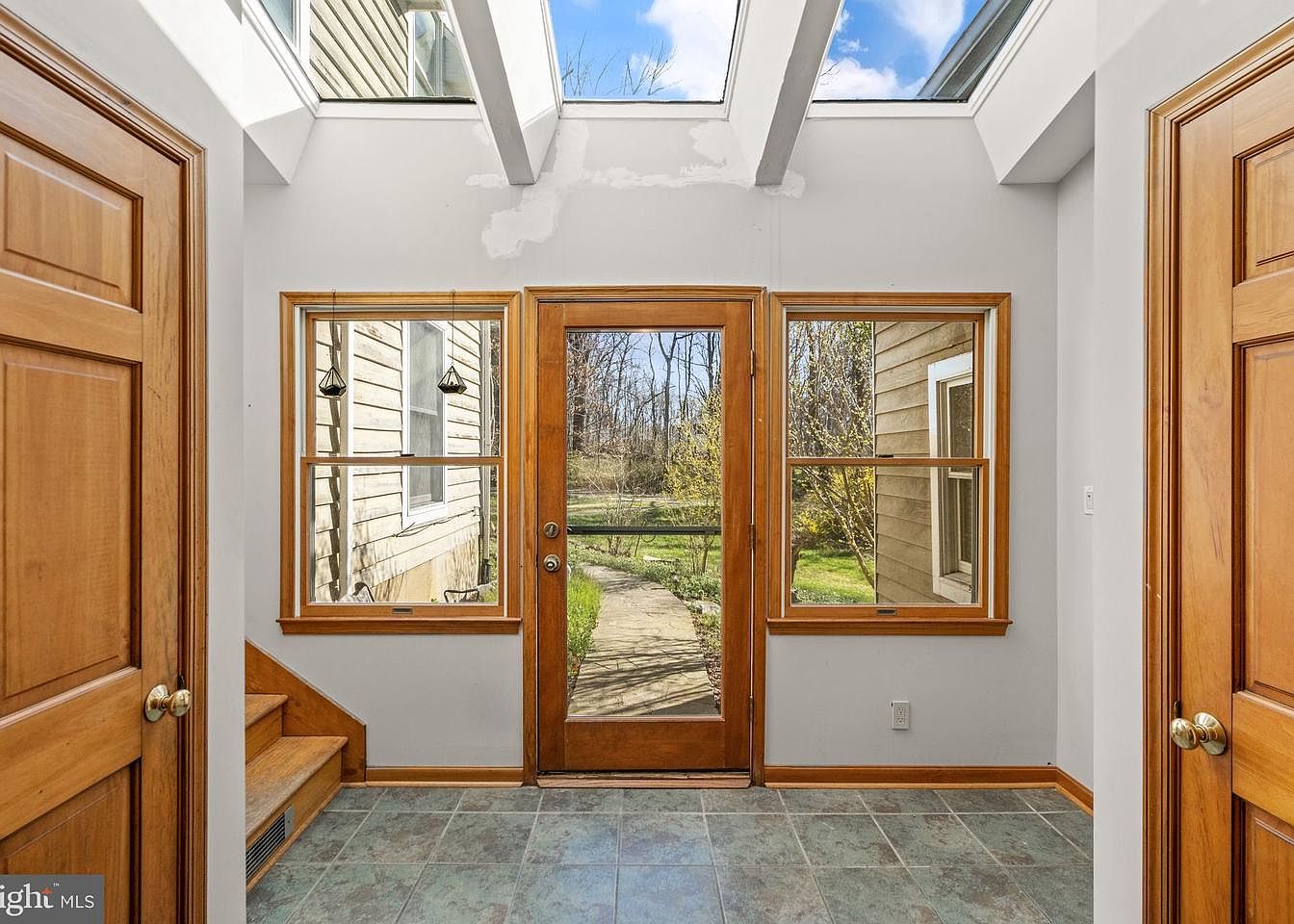 This entryway features a welcoming design with natural light filtering through skylights and large windows. The walls are painted in a soft gray, complementing the warm-toned, wooden doors and trim that frame the space. A set of wooden stairs to the left leads to the upper levels, while a clear view through the central glass door provides access to the outside, inviting a connection with nature. The tile flooring in cool, muted tones enhances the airy feel, while the blend of architectural elements, like the exposed beams, adds character and warmth. This space exudes a rustic charm.