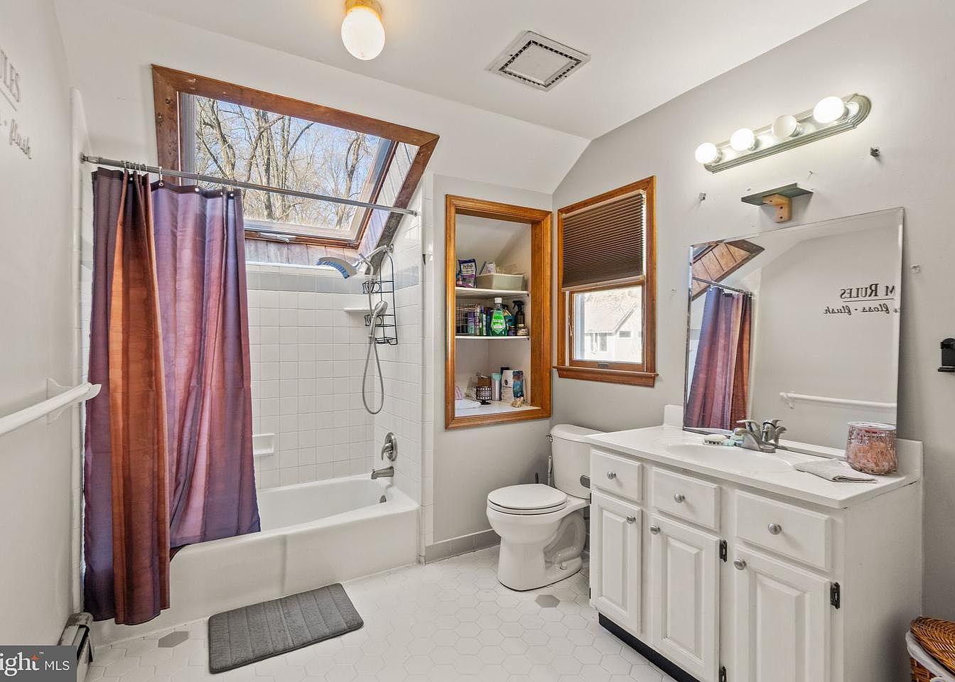 This bathroom features a clean, modern design with a combination of white and soft gray tones. The exposed wooden elements, including a skylight frame and window trims, add warmth to the space. A white bathtub with a built-in shower is adorned with a rich maroon curtain, providing a splash of color. Hexagonal floor tiles enhance the contemporary look, while the large mirror above the sink reflects natural light. A compact storage space beside the sink houses toiletries, maximizing utility. Soft yet bright lighting fixtures complete the ambiance, balancing functionality and aesthetic appeal.