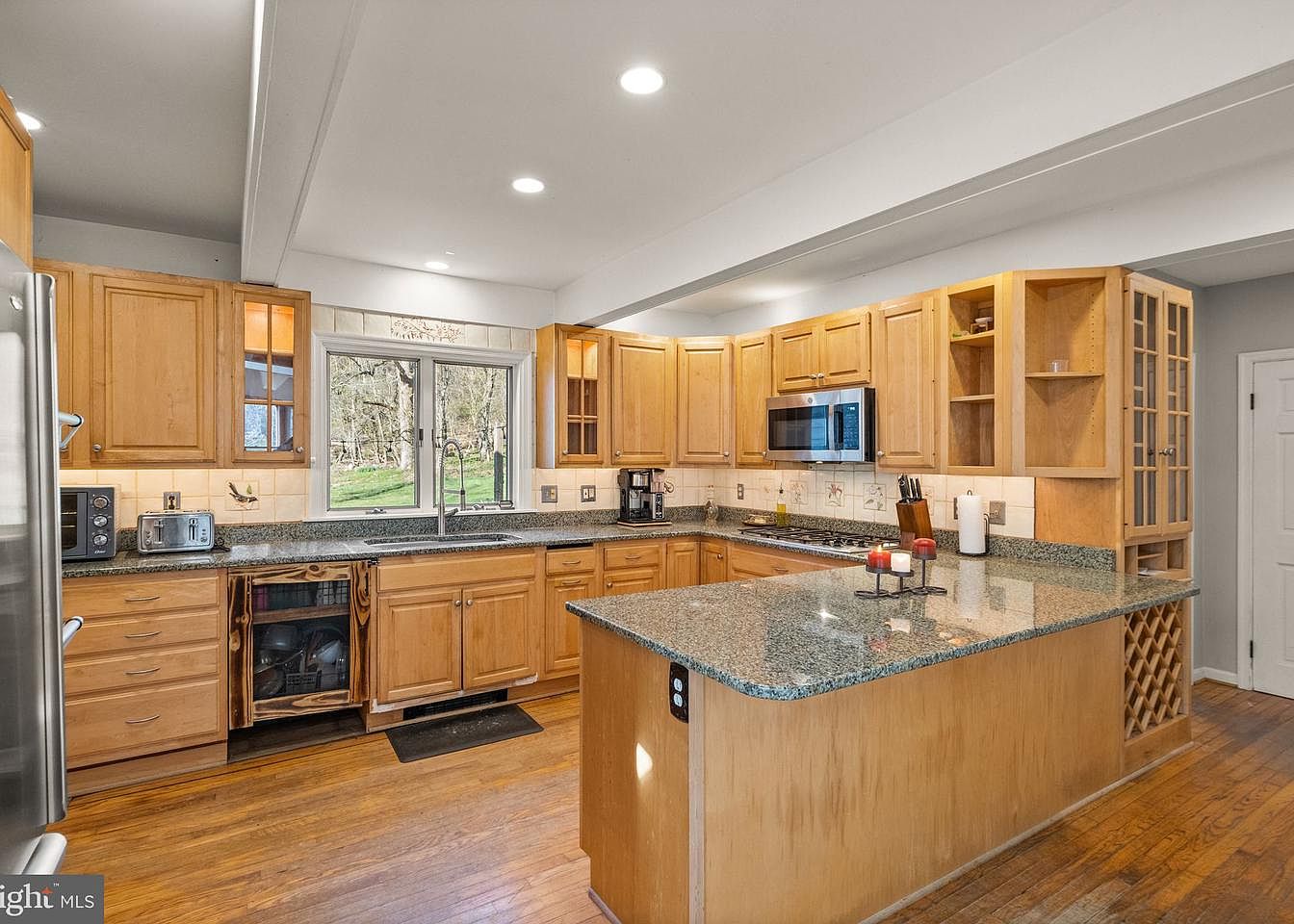 This kitchen features warm wooden cabinetry complemented by a rich granite countertop. The light wood tones create a cozy ambiance, contrasted by the dark speckled surface that adds sophistication. A large window illuminates the space, providing a view of the outdoors while enhancing natural light. Stainless steel appliances, including a microwave and coffee maker, integrate modern functionality. Decorative elements like the backsplash tiles feature subtle designs, adding character. The open layout flows seamlessly into the cooking areas, and the island serves as a practical workspace, complete with built-in electrical outlets and ample storage beneath.