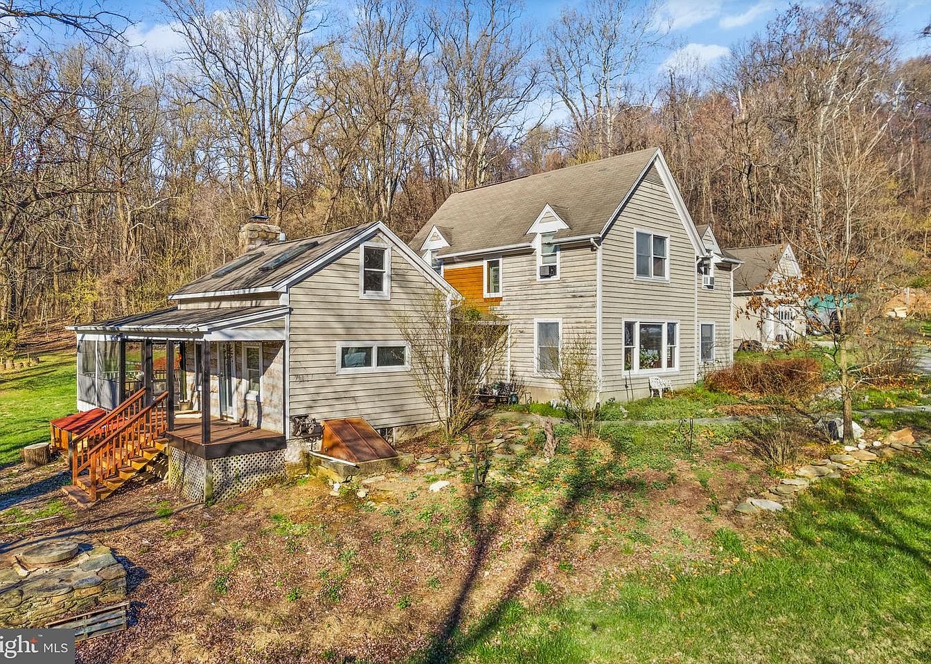 The image showcases a charming historic home nestled amidst a serene wooded backdrop. The house features a combination of beige siding and wooden accents, with a steeply pitched roof capturing a rustic aesthetic. A wooden deck extends to the left, leading to an inviting screened porch with large glass windows that enhance natural light. The front yard includes stone pathways and partially landscaped areas with greenery, lending an organic touch. A circular stone fire pit is visible, providing a cozy gathering spot. The surrounding trees are bare, indicating an early spring or late fall atmosphere, enhancing the tranquil feel.