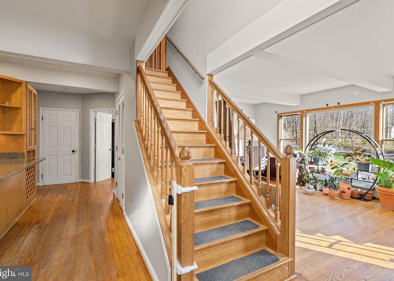 The space features a welcoming entryway with a staircase on the right, adorned with wooden railings and carpeted steps for comfort. The warm wooden flooring complements the soft gray walls, creating an inviting atmosphere. To the left, a built-in wooden bar is accented with glass-fronted cabinets, suggesting a blend of functionality and charm. Natural light floods the room from large windows, highlighting a green indoor garden filled with various plants. Additional doors in the background add depth and accessibility to nearby rooms, enhancing the home’s inviting and open layout.