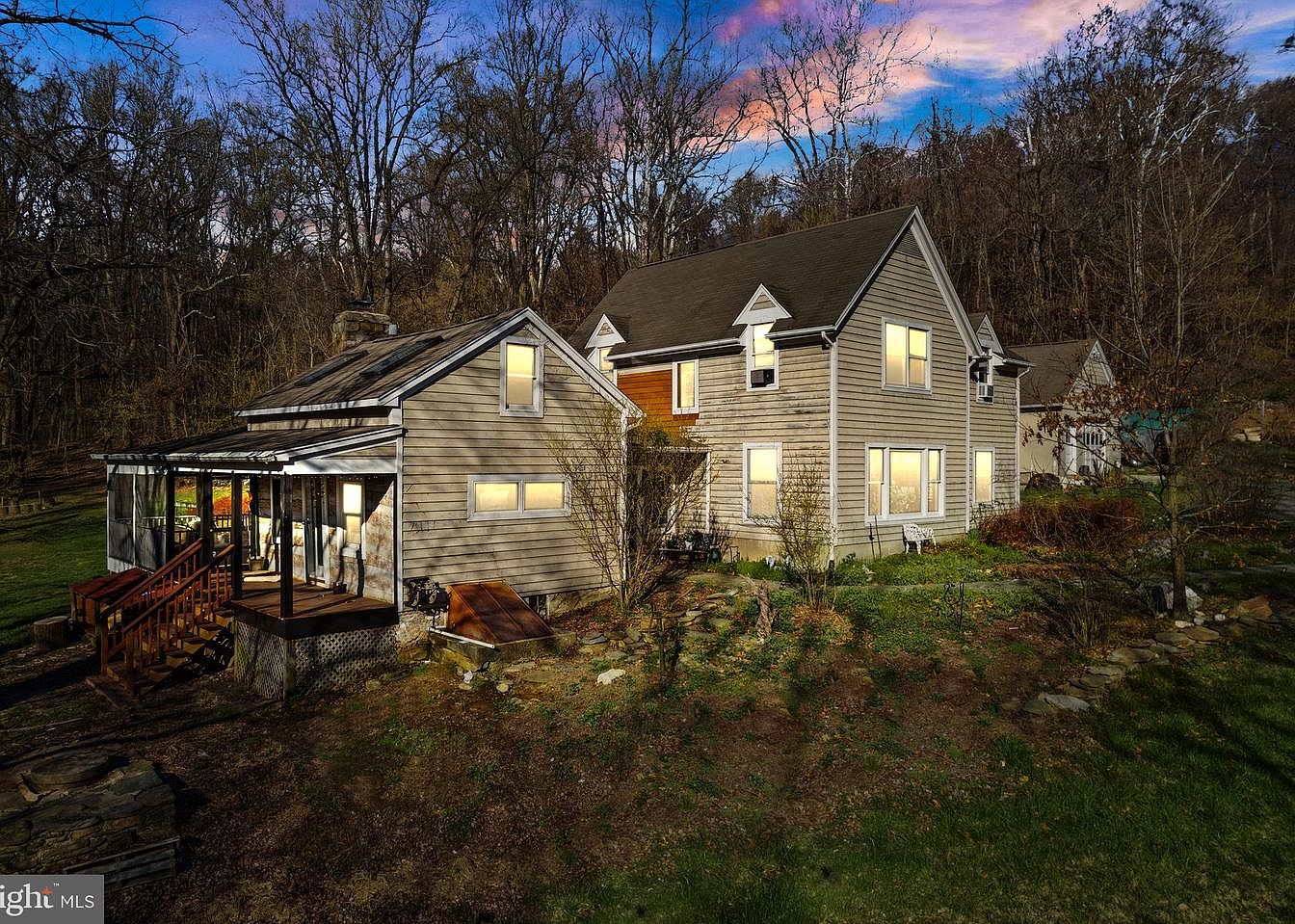 A charming historic home showcases a two-section design, featuring a larger structure with a gabled roof and a smaller wing. The exterior is clad in soft beige wood siding, complemented by crisp white trim around windows that invite natural light. A cozy porch extends from the side with timber railings, leading to an open space adorned with stone accents and vibrant greenery. Verdant grass surrounds the home, echoing the natural beauty of the forest backdrop. The warm glow from interior windows hints at a welcoming ambiance, while the pink and blue hues of dusk add to the serene atmosphere.