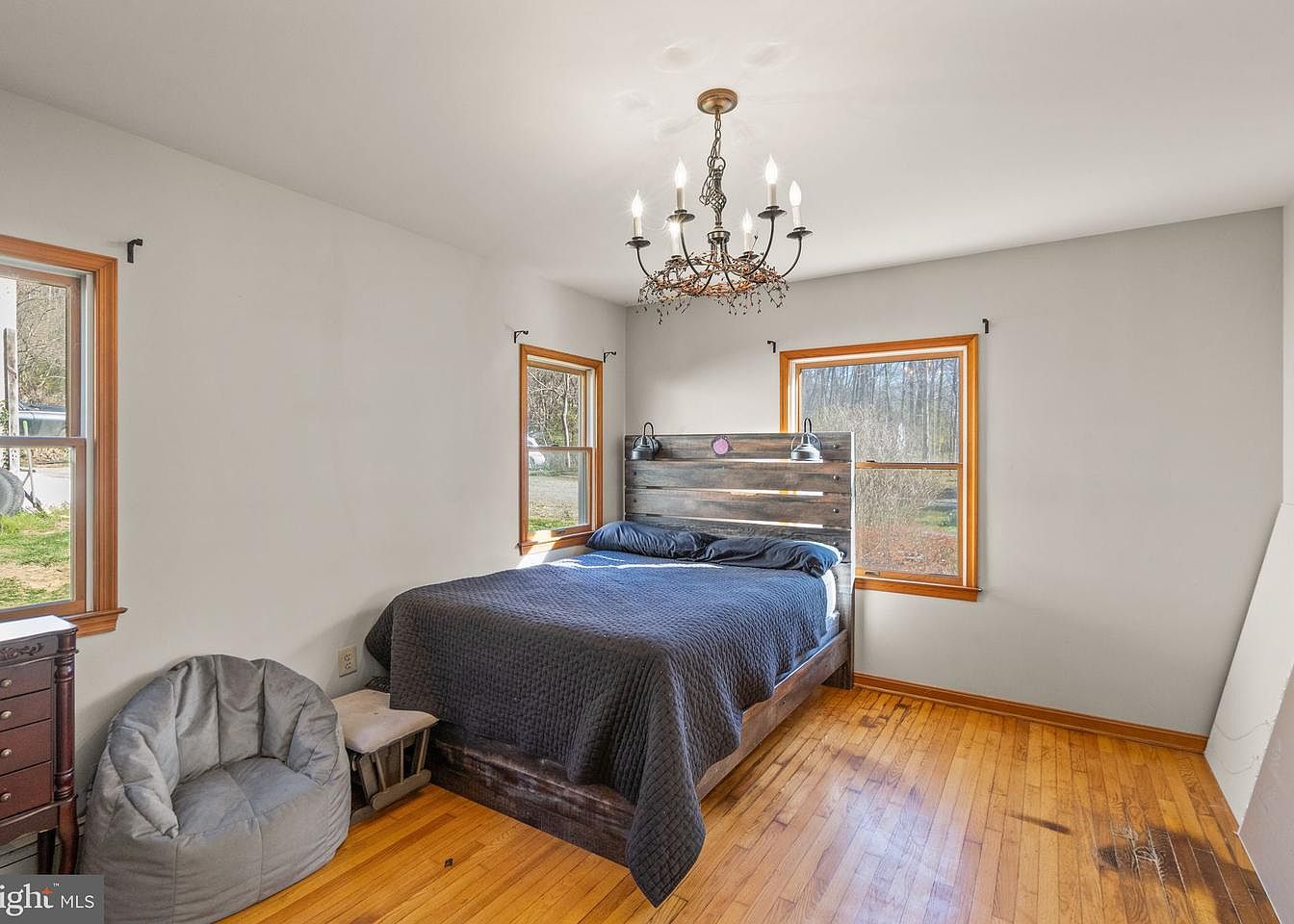 The bedroom features a cozy layout with a wooden bed frame showcasing a rustic headboard. Soft, dark bedding contrasts with the light walls, amplifying the space’s warmth. Natural light floods through two windows, framed with wooden trim, providing a serene view of the outdoors. A decorative chandelier hangs from the ceiling, adding a touch of elegance amidst the minimalist decor. To one side, a plush bean bag chair offers comfort, accompanied by a small nightstand that hints at practicality. The rich wooden flooring complements the overall scheme, enhancing the inviting ambiance of the room.