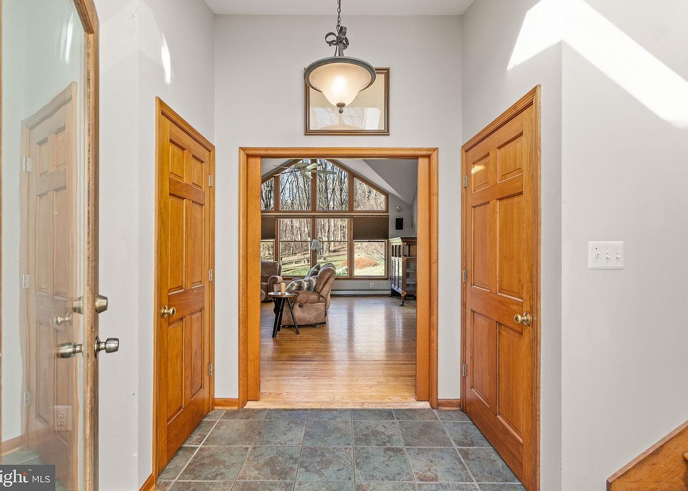 The entryway features a spacious design with slate tile flooring that imbues a rustic charm. Light gray walls enhance the brightness, complemented by rich wooden doors and trim that provide warmth. A large light fixture hangs from the ceiling, casting a welcoming glow. Two wooden doors open to rooms on either side, while a wide archway leads into a sunlit living area. The living room showcases large windows that frame the natural landscape outside, featuring plush seating and a wooden cabinet. This combination of natural materials and elegant design elements creates a harmonious entrance.