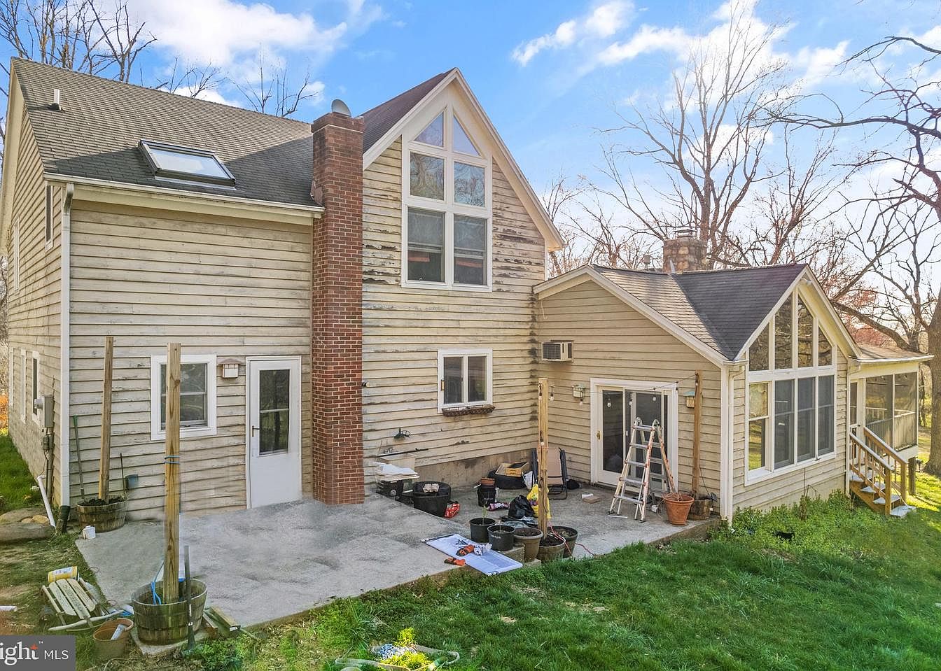 The image shows the rear exterior of a historic American home. A mix of vertical wooden siding in a natural wood tone and red brick chimneys add character. The house features large, multi-pane windows, allowing ample light, especially in the sunroom, which has a vaulted glass roof. A concrete patio extends into a grassy area, surrounded by flower pots, ladders, and garden tools, indicating ongoing maintenance. The property is framed by bare trees, hinting at a seasonal change, and the overall design showcases a blend of contemporary elements with a traditional aesthetic.