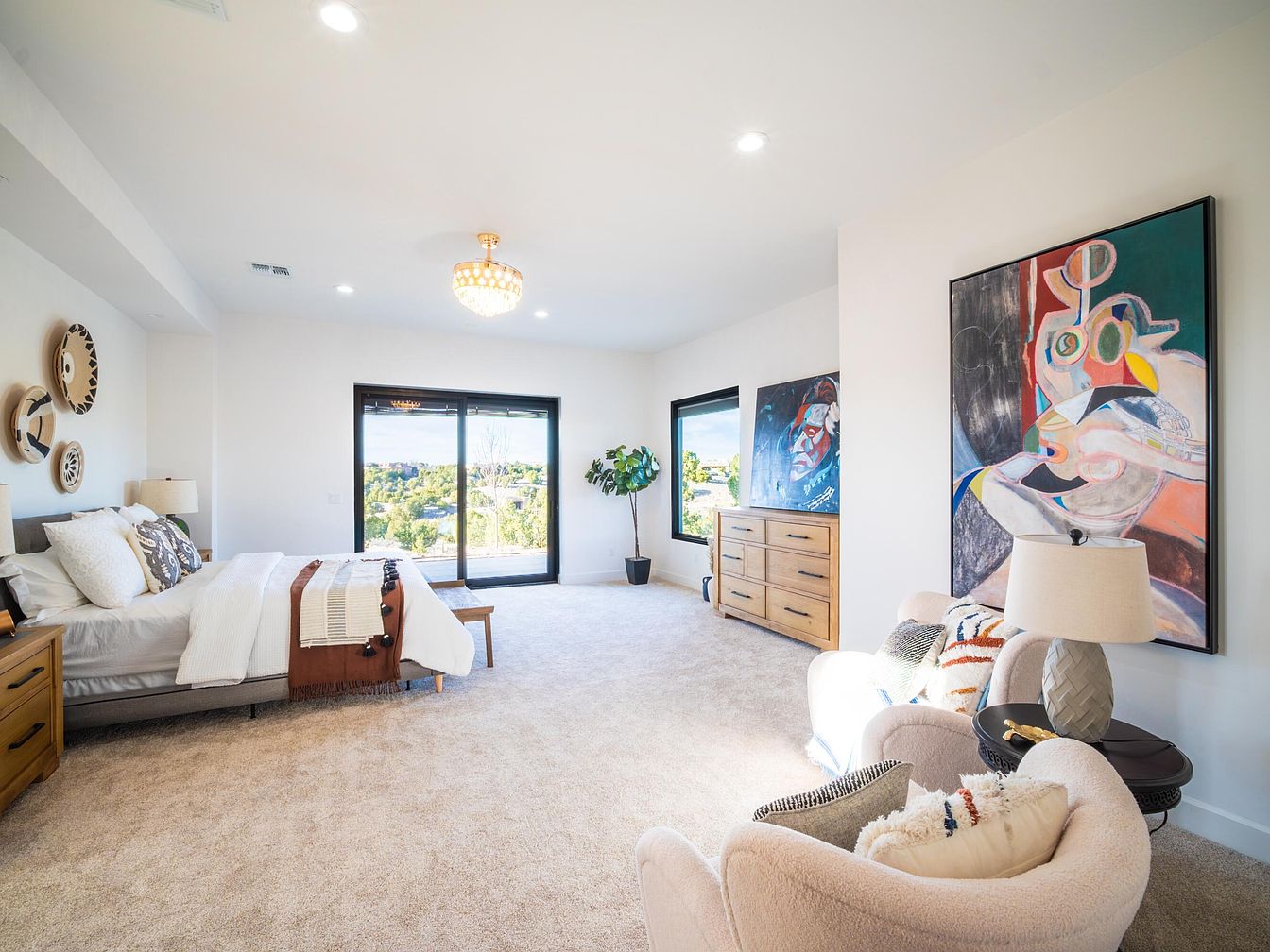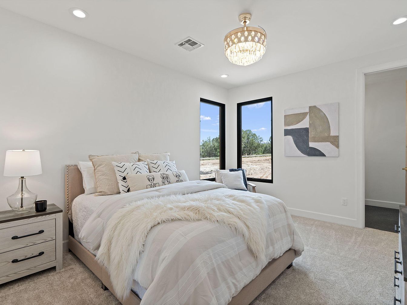 This spacious bedroom features a serene atmosphere with neutral color tones and plush carpeting. A large bed is adorned with decorative pillows and a textured throw blanket, enhancing the cozy feel. To the side, a sleek wooden dresser provides ample storage, while an elegant lamp adds warmth. A pair of inviting upholstered chairs sit adjacent, perfectly positioned for relaxation and conversation. Large windows allow natural light to flood the room, framed by black accents, and showcase a beautiful outdoor view. Artistic wall hangings introduce a modern flair, complementing the minimalist layout and creating an inviting space.