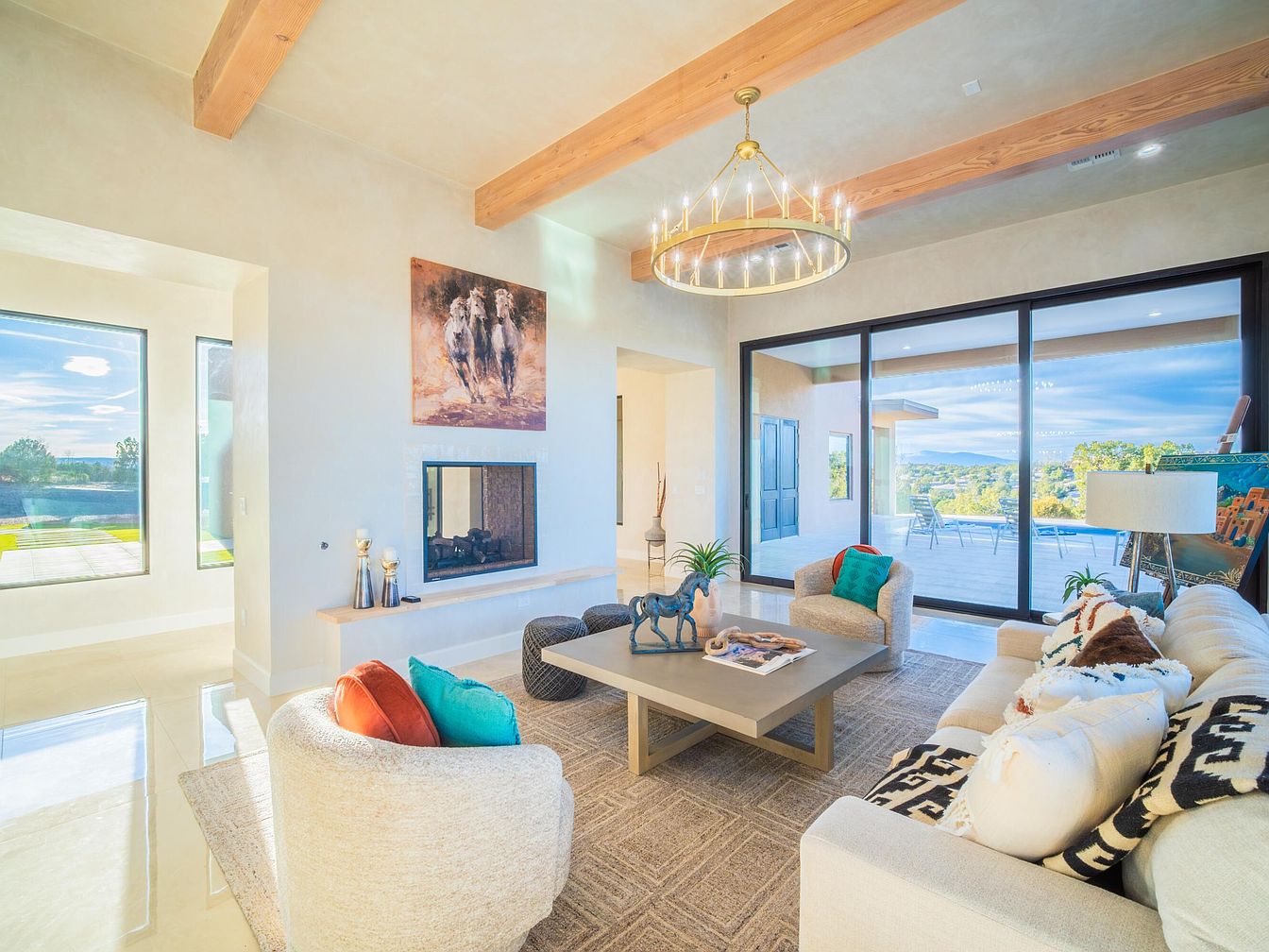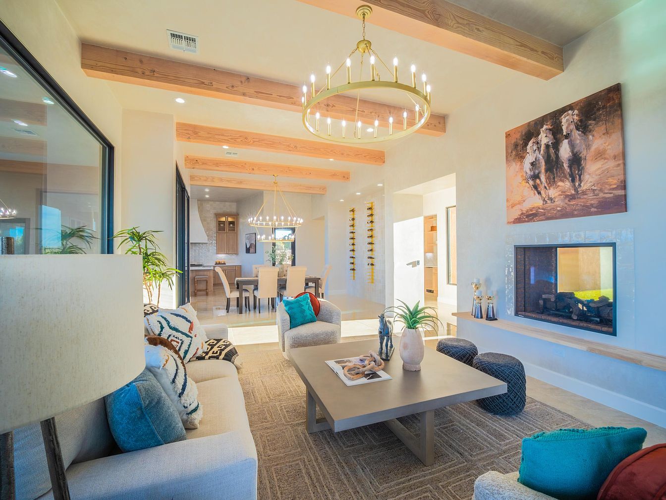 A spacious living room features high ceilings with exposed wooden beams, enhancing an inviting and airy atmosphere. The neutral color palette of soft beige and warm browns is accented by vibrant cushions in turquoise and red, adding visual interest. A contemporary coffee table sits at the center, surrounded by a comfortable sofa adorned with textured pillows. The room is illuminated by a circular chandelier, creating a warm glow. A cozy fireplace built into the wall adds warmth, while an artwork of galloping horses complements the aesthetic. A dining area in the background extends the airy, connected feel.