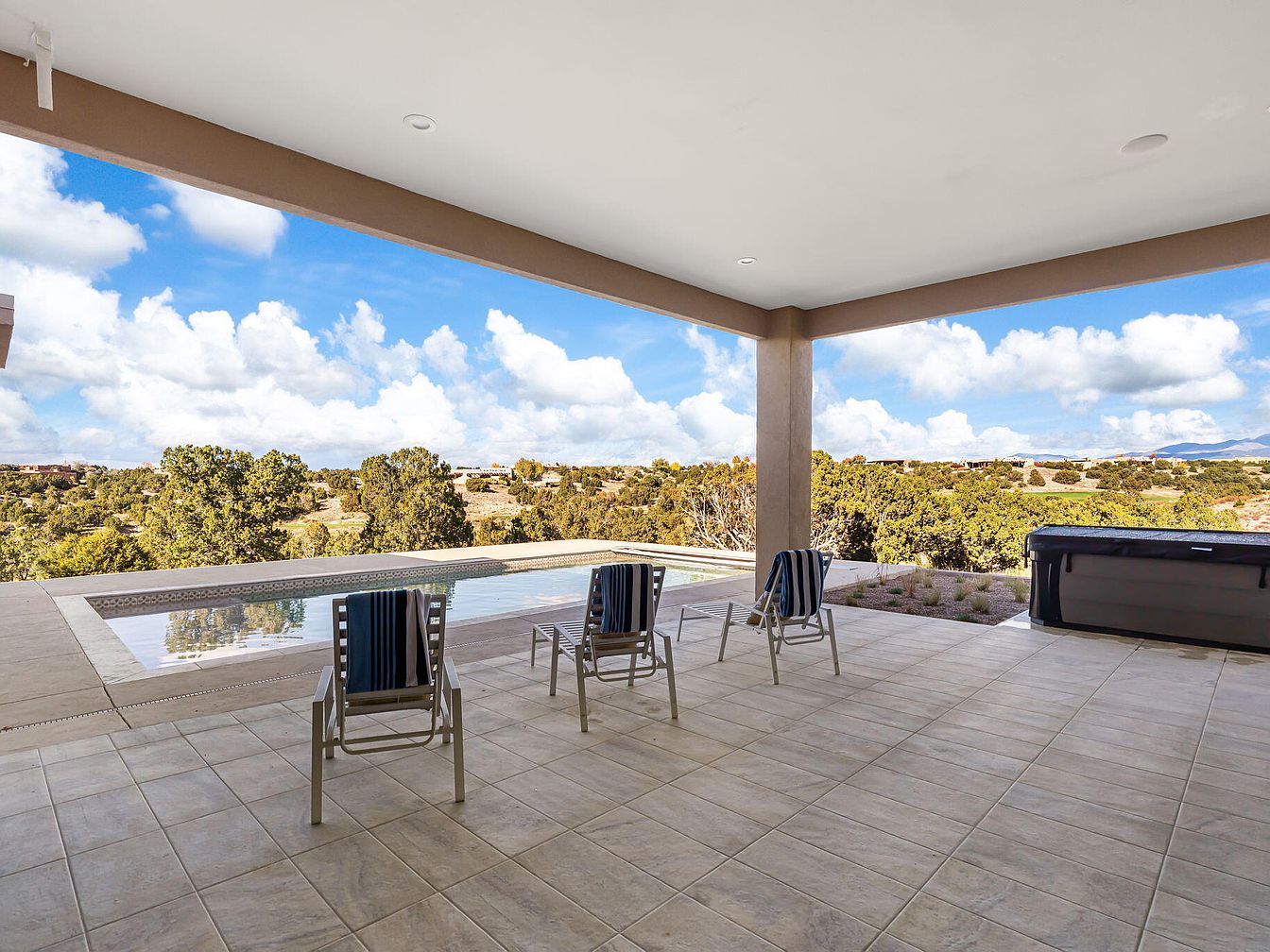A spacious patio features an expansive tile floor that elegantly meets the outdoor environment. Three modern, silver metal chairs with dark blue and white striped cushions face a serene view of rolling landscapes and greenery. A small, rectangular pool reflects the open sky, enhancing the tranquil atmosphere. The patio is partially shaded by an overhanging roof, providing comfort against direct sunlight. A hot tub, discreetly placed to one side, adds a touch of luxury. The color palette is a blend of earthy tones and blues, fostering a calming escape, perfect for relaxation or social gatherings.