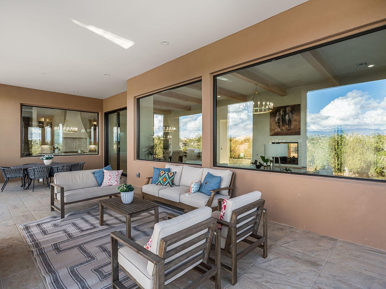 A spacious patio features a modern, yet inviting seating arrangement with light beige sofas accented by vibrant cushions in geometric and floral patterns. The wooden furniture stands in contrast to the tiled floor, enhancing the outdoor feel. A contemporary coffee table complements the seating, while a woven dining set with dark tones adds to the area. Large, floor-to-ceiling windows allow natural light to flood in, showcasing views of the surrounding landscape and mountains. Soft, neutral walls paired with the earthy tones of the furniture create a harmonious ambiance, ideal for relaxation or social gatherings.