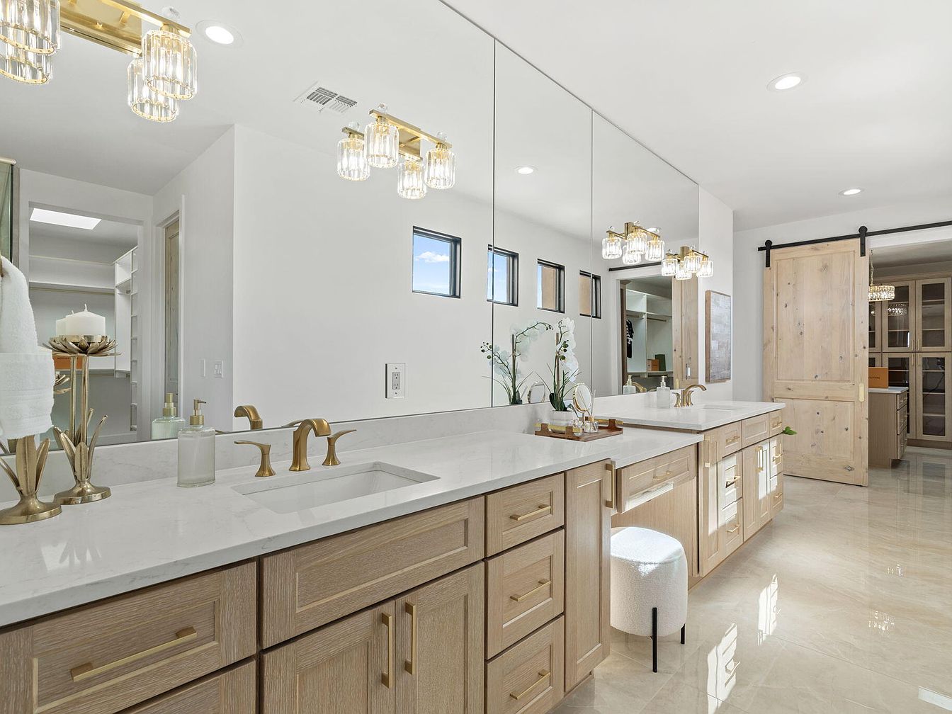 This elegant bathroom features a spacious layout with a double vanity topped in pristine white marble. Natural wood cabinetry, accented with gold hardware, adds warmth and sophistication. Above the vanity, a series of sparkling glass light fixtures illuminate the area, highlighting the clean lines of the minimalist design. A large mirror stretches across the wall, reflecting natural light from high-set windows, creating an airy feel. A modern barn door adds a rustic touch, contrasting with the polished porcelain tiles that shine underfoot. Subtle decor elements, like potted greenery, enhance the serene, spa-like atmosphere.