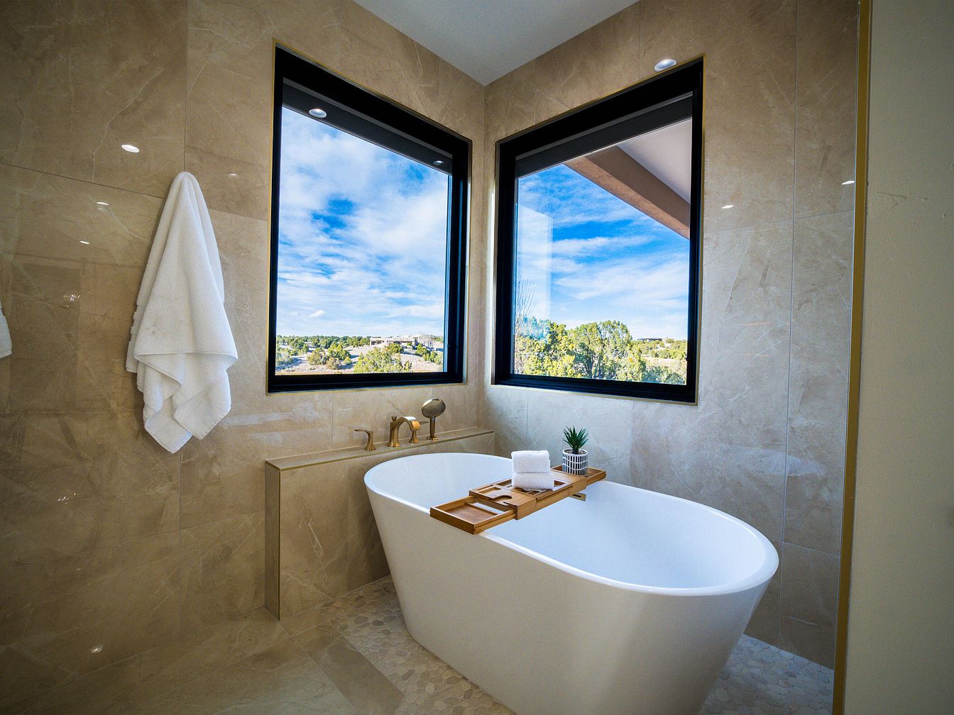 This serene bathroom features a luxurious freestanding bathtub, elegantly positioned beneath two large black-framed windows that provide a view of the outside greenery and sky. The walls are adorned with polished beige marble, enhancing the space’s sophistication. A wooden bath tray rests atop the tub, holding neatly rolled towels and a small potted succulent. Delicate gold fixtures offer a touch of warmth and contrast against the cool tones of the marble. Light streams in, creating a bright and inviting atmosphere, while a cozy robe hangs nearby, suggesting comfort and relaxation.