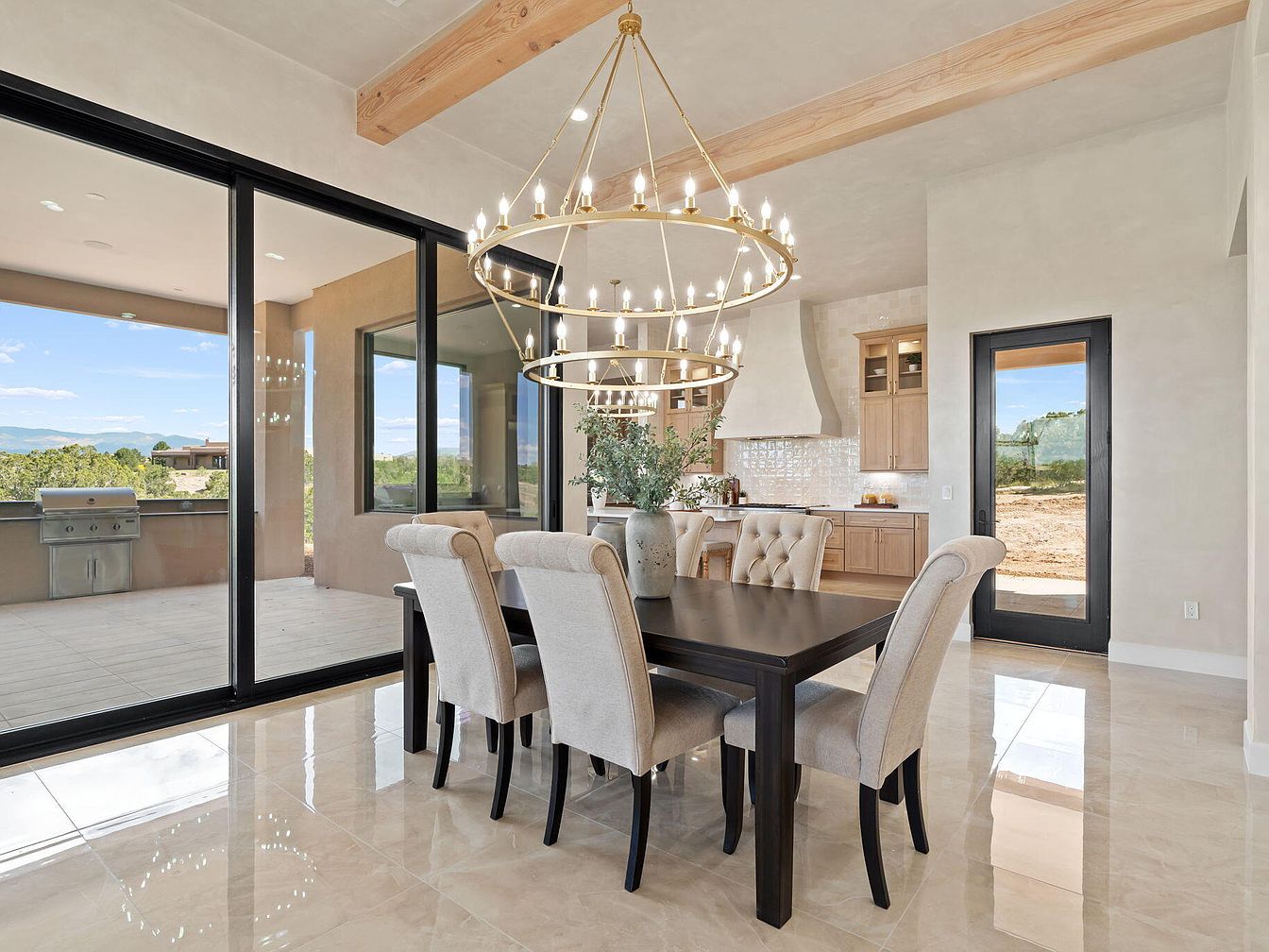 A modern dining area featuring a large dark wood table surrounded by beige upholstered chairs, each with a tufted design. Above, an elegant circular chandelier illuminates the space, its warm light enhancing the room’s inviting atmosphere. The walls are a soft, neutral tone, complementing the polished marble flooring that reflects light beautifully. Large sliding glass doors open to an outdoor area, bringing in natural light and offering scenic views of the surrounding landscape. An adjoining kitchen area with light wood cabinetry and a stylish backsplash adds to the contemporary aesthetic, creating a seamless flow between spaces.