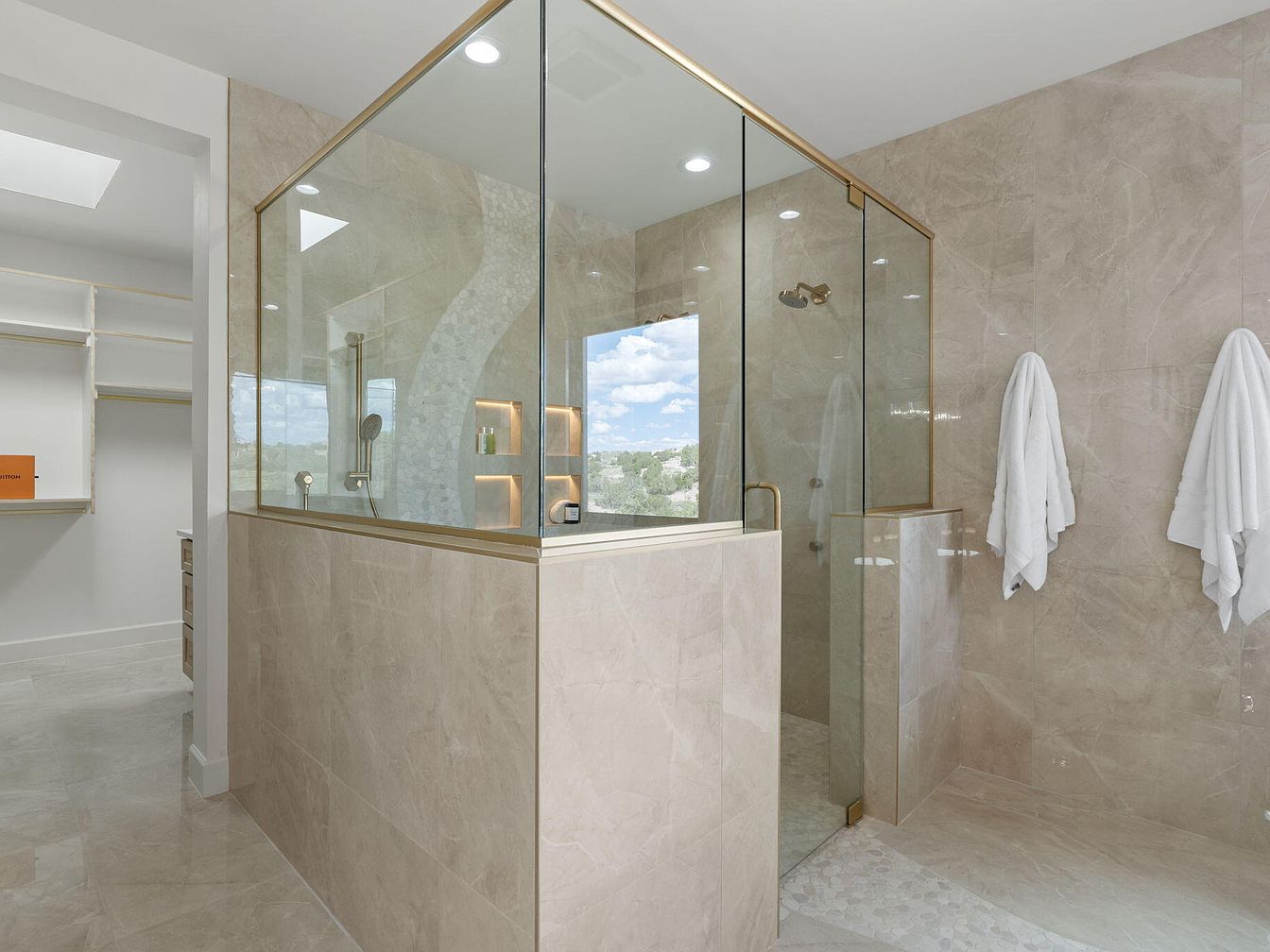 A spacious luxury bathroom featuring a modern glass-enclosed shower is highlighted. The walls are adorned with elegant light beige marble, creating a serene atmosphere. A seamless layout showcases a cohesive design, with polished stone surfaces extending across the floors. The shower features a sleek gold frame, enhancing the contemporary feel, while built-in shelves showcase minimalist decor. Bright, natural light floods the space through a window, allowing for a refreshing vibe. White fluffy towels are neatly hung, adding a touch of comfort. A nearby open closet area offers organized storage, completing this refined and functional design.