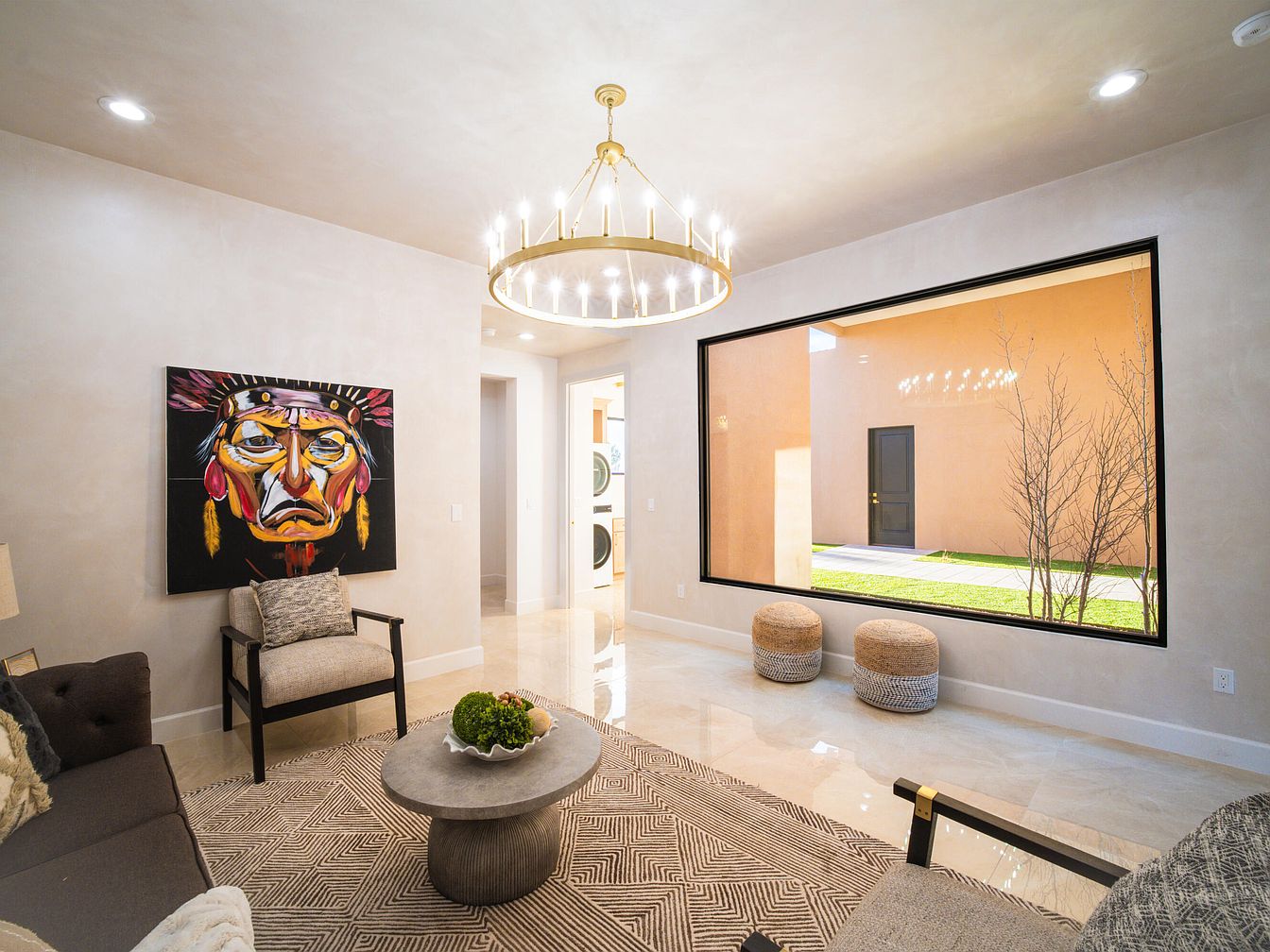 A spacious living room features a modern aesthetic with neutral tones and warm natural lighting. The walls are finished in soft beige, creating a calming backdrop. A striking artwork of a Native American figure with vibrant colors stands out, adding cultural significance. The seating area includes a plush dark gray sofa and an accent chair, both inviting and comfortable. A round, textured coffee table complements the geometric patterned area rug beneath. Large windows frame the outdoor space, inviting views of greenery. Decorative poufs in woven fabric provide additional seating, enhancing the room’s inviting atmosphere.
