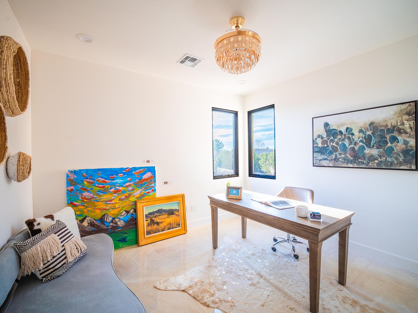 This home office features a bright, airy ambiance with ample natural light from large windows. A sleek wooden desk occupies the center, paired with a modern rolling chair. Neutral tones dominate the palette, complemented by soft textures like the creamy rug beneath. Wall art, including vibrant landscapes and abstract pieces, adds character and color. A cozy settee with patterned cushions invites relaxation, while woven wall hangings enhance the aesthetic appeal. The elegant chandelier above provides a touch of sophistication, blending contemporary design with inviting comfort. Overall, the space promotes productivity and creativity.