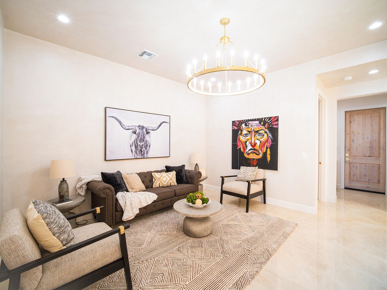 This welcoming living room showcases a blend of contemporary and rustic design elements. A plush brown sofa adorned with cream and patterned pillows anchors the space, complemented by a light gray area rug with a geometric pattern. Accent chairs with dark wood frames and textured upholstery provide additional seating. Bold artwork featuring a native-inspired theme adds vibrant color to the walls, contrasting against the soft beige paint. A stylish, round coffee table made of natural wood finishes the look, while a modern chandelier overhead adds elegance. The room is illuminated by recessed lighting, enhancing its cozy ambiance.