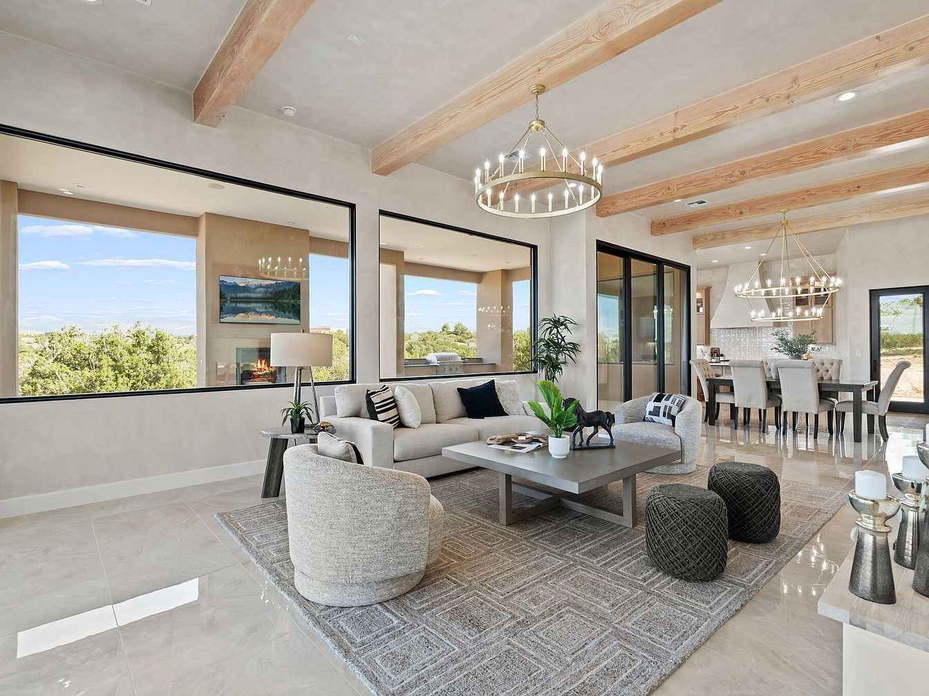This spacious living room features a harmonious blend of modern and rustic elements. High ceilings showcase exposed wooden beams, adding warmth to the neutral-toned walls. Large floor-to-ceiling windows flood the area with natural light, offering picturesque views of the outdoors. A soft beige sectional sofa is adorned with black and white cushions, paired with a geometric area rug that enhances comfort. A sleek coffee table sits atop the rug, complemented by stylish round poufs. Elegant chandeliers illuminate the space, while a subtle fireplace offers coziness, creating an inviting atmosphere for relaxation and gatherings.
