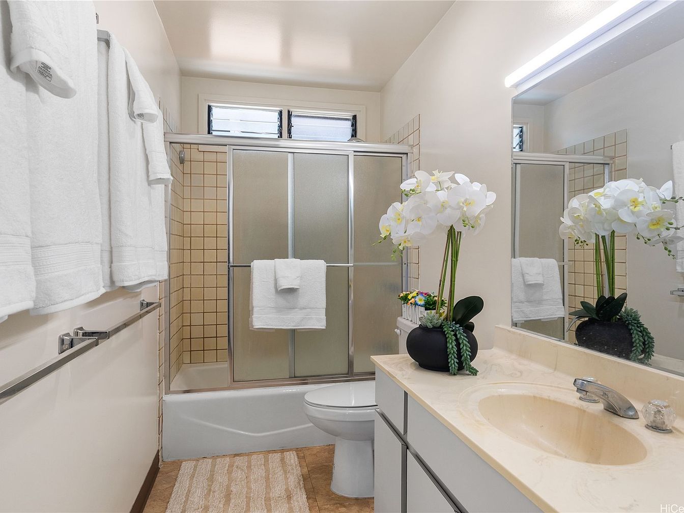 This bathroom features a clean, modern design with a soothing color palette of soft creams and whites. The space showcases a glass shower enclosure surrounded by light beige tiled walls, enhancing the spacious feel. A minimalist countertop hosts a sleek sink with simple hardware, while a decorative black vase holds elegant white orchids, adding a touch of nature. Plush white towels hang neatly on a rack, contributing to a fresh ambiance. The natural light filters through small frosted windows above, providing brightness without compromising privacy.