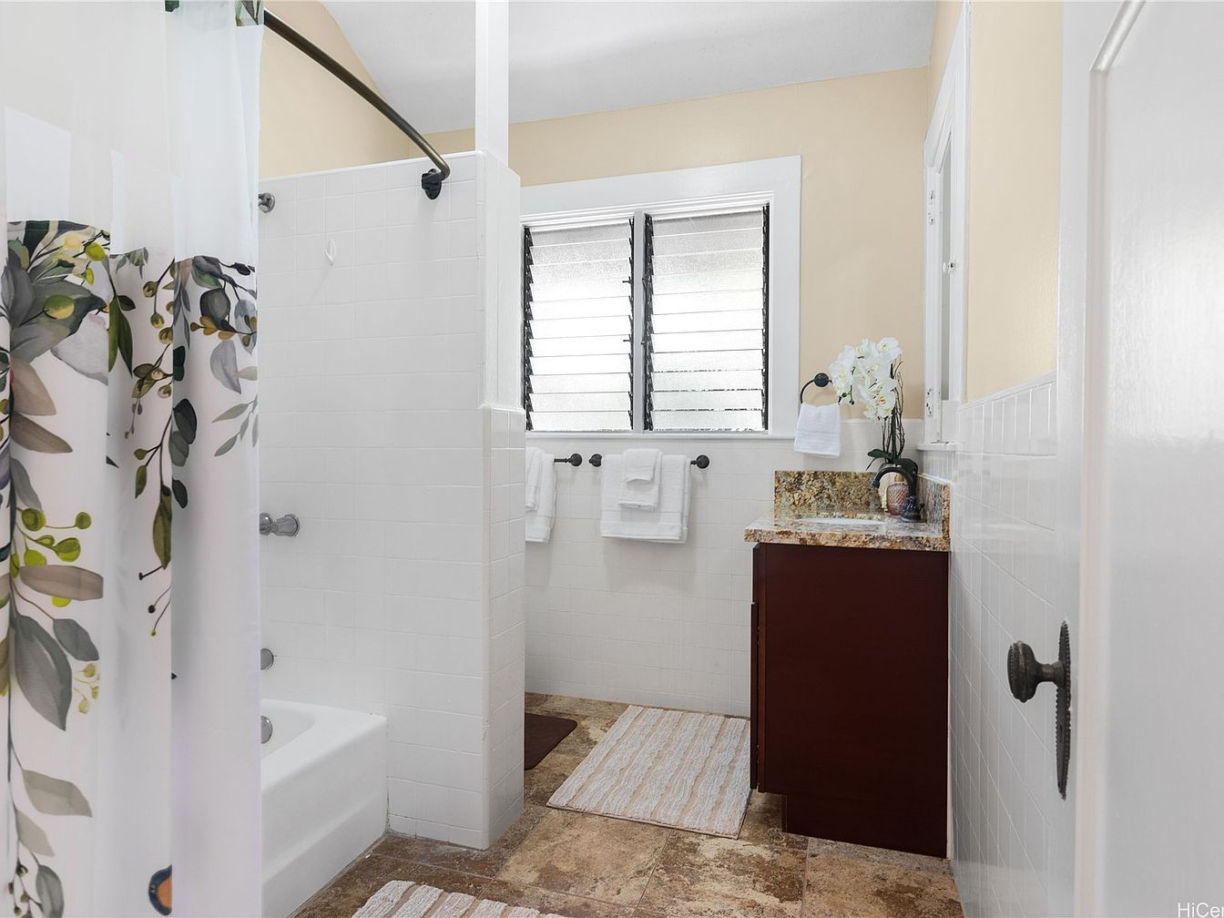 This bathroom features a clean, functional layout with a focus on simplicity and modern charm. The shower area, enclosed by white tiles and a curved rod draped with a floral curtain, adds a touch of elegance. A granite countertop complements the dark wood cabinetry beneath a large mirror, while multiple white towels hang neatly on black hooks, contributing to a fresh, organized feel. Light beige walls enhance the brightness, complemented by natural light from the window fitted with slatted shutters. The caramel-toned flooring and decorative rug provide warmth, creating an inviting and stylish space.