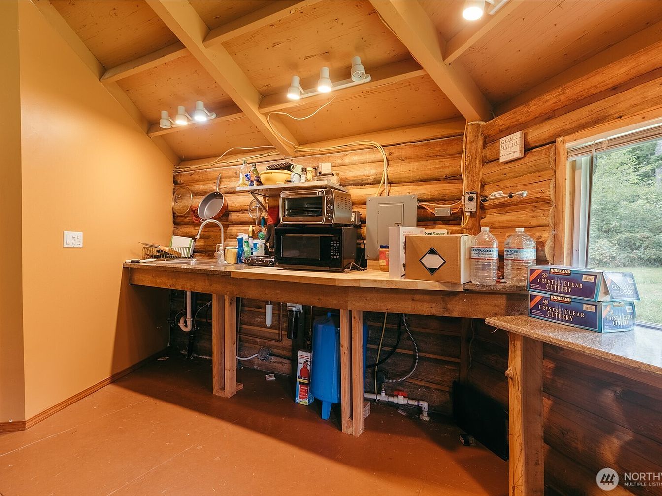 This cozy kitchen area features sturdy wooden countertops and classic log cabin walls, creating a warm and inviting space ideal for families. The natural wood tones of the logs, ceiling beams, and open shelving highlight the cabin’s rustic charm. Practical amenities, such as a toaster oven, dish rack, and essential supplies, are easily accessible, making everyday tasks simple and convenient for busy family life. The room is well-lit with bright ceiling lights, and a large window brings in natural daylight and offers a peaceful view of greenery outside. Practical storage and durable materials enhance its family-friendly functionality.