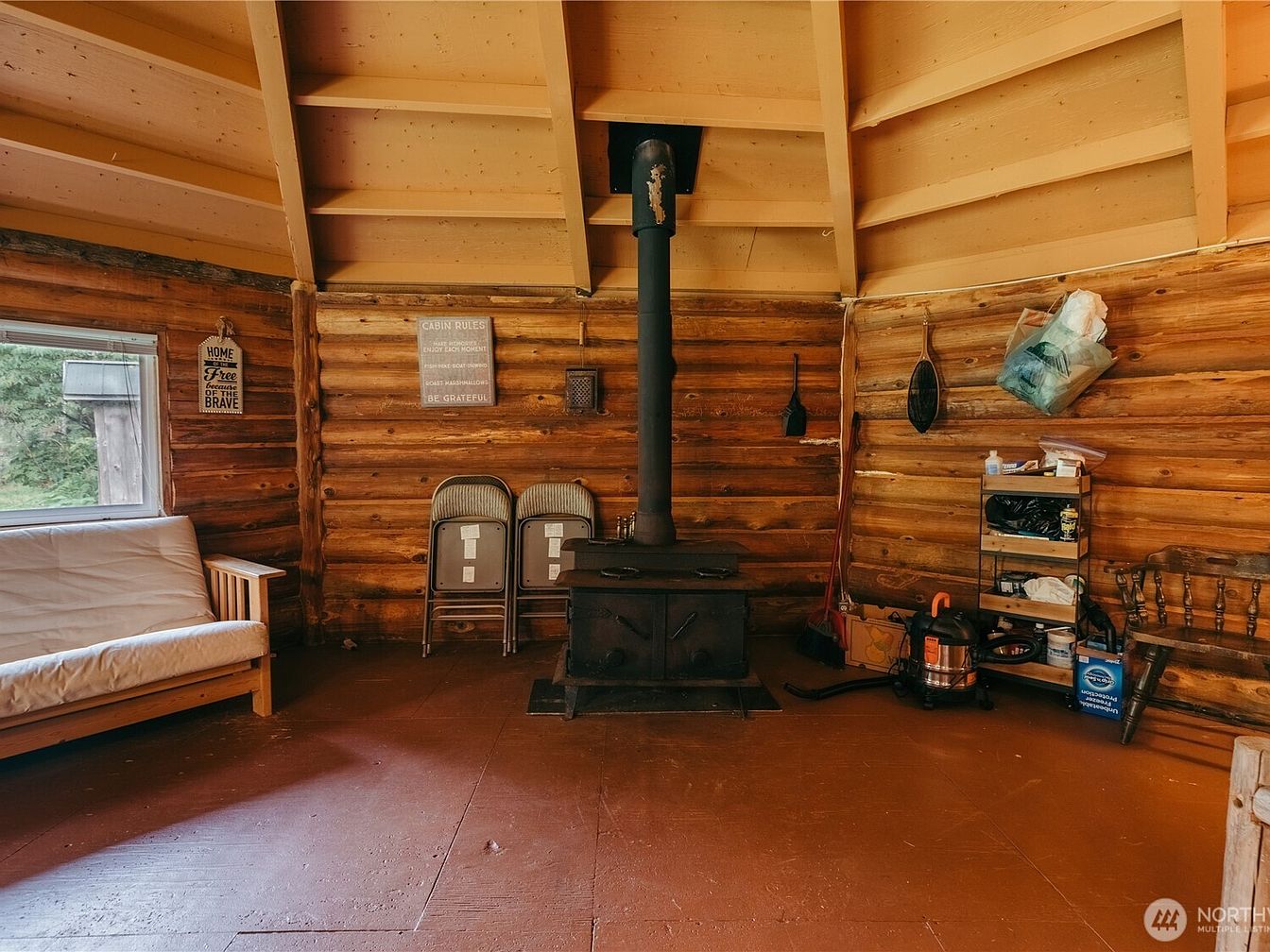 This room features a rustic log cabin design with warmly toned, natural wood walls and exposed beams in the ceiling, creating a welcoming and comfortable atmosphere ideal for families. Central to the space is a black wood-burning stove, perfect for gathering around during colder months. A sturdy wooden futon with a simple white cushion sits below a wide window, inviting natural light and offering pleasant views of the outdoors. The space is functional with folding chairs, practical shelving holding everyday necessities, and wood accents throughout. The uncluttered floor allows for easy movement, making it safe and adaptable for family life.