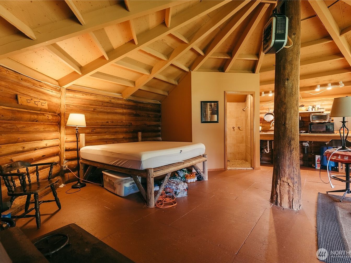 Warm wooden logs line the walls and ceiling beams, creating a cozy cabin feel perfect for a family getaway. A simple wooden bed with storage boxes underneath is thoughtfully placed near a soft floor lamp, while a classic chair adds functional seating. The earth-toned floor and exposed beams give the space a natural, earthy ambiance. A separate tiled shower area and kitchenette in the background add modern convenience, including small appliances neatly arranged for easy family use. The open plan allows visibility and ease of access, making it ideal for families seeking comfort, safety, and a homely atmosphere.