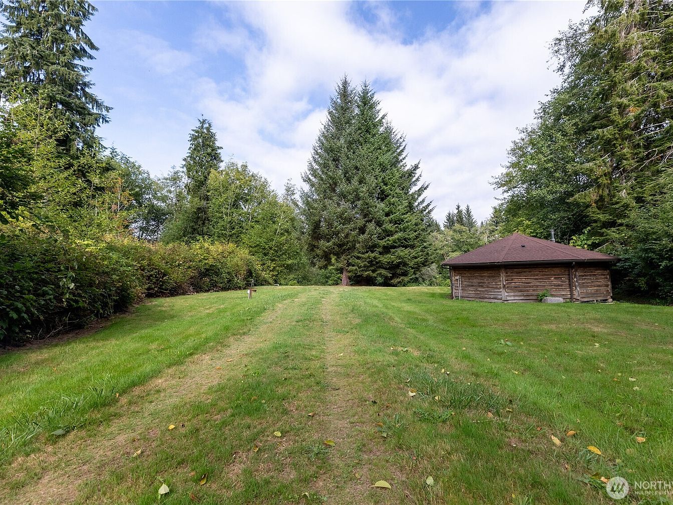 A wide backyard lawn showcases a spacious, open grassy area surrounded by lush greenery and tall evergreen trees that create a peaceful, private setting. The flat expanse provides ample space for outdoor family activities, children’s playsets, or summer gatherings. To the right sits a rustic wooden outbuilding with a dark brown shingle roof, perfect for storage or as a workshop. The well-maintained grass and the natural landscape offer a safe and inviting environment for families. The surrounding mature trees add to the sense of seclusion and tranquility, making it an ideal spot for play, relaxation, and outdoor entertaining.