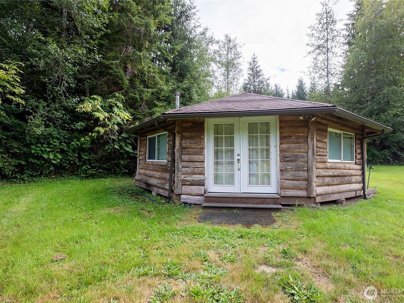 A cozy log cabin sits on a lush green lawn surrounded by mature trees, creating a tranquil and private setting perfect for families. The exterior features rustic natural wood logs and a simple shingled roof, evoking a classic country charm. Large white-framed French doors provide a welcoming entrance and allow plenty of natural light to stream inside. Several wide windows offer views of the scenic outdoors, enhancing the connection between indoor and outdoor spaces. The spacious grassy area is ideal for children to play safely, while the surrounding forest ensures privacy, peace, and a close connection with nature.
