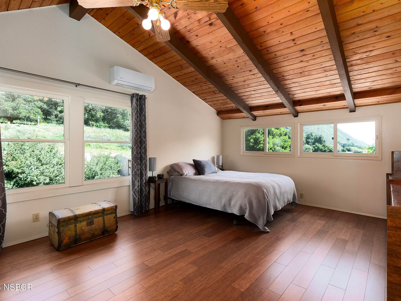 A spacious bedroom featuring a vaulted ceiling with exposed wooden beams, showcasing a warm, rustic charm. The room is adorned with large windows that invite abundant natural light and offer views of lush greenery outside. The walls are painted in soft neutral tones, complementing the rich brown hardwood floors that add warmth to the space. A simple, well-made bed is dressed in light gray bedding, creating a calming atmosphere. In one corner, a vintage trunk serves as both decor and storage, while sleek bedside tables house modern lamps, reflecting a blend of contemporary and traditional aesthetics.