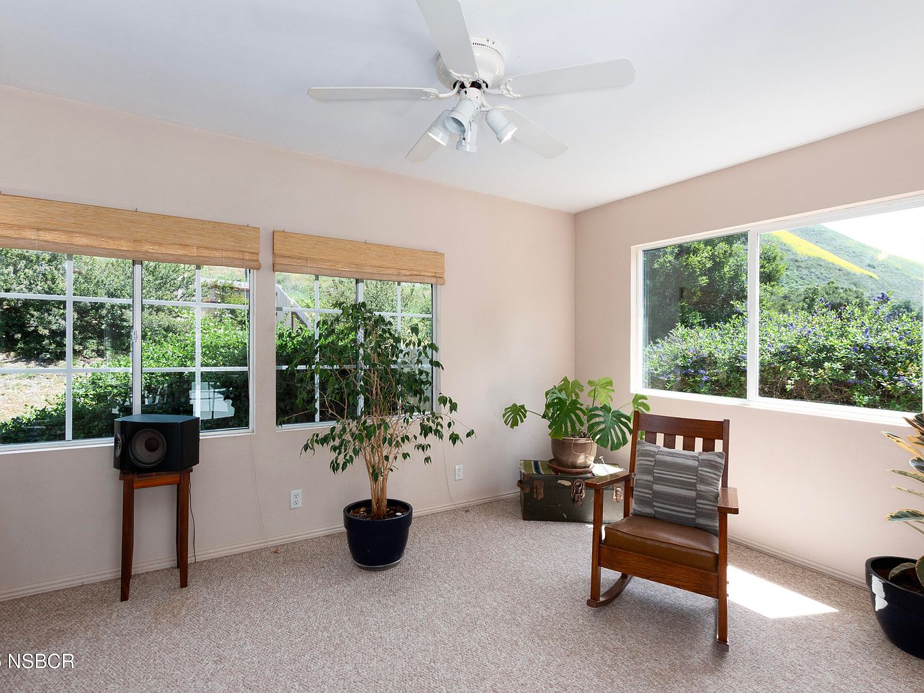 This sunroom features large windows that bathe the space in natural light, highlighting the soft beige walls and neutral carpet. The décor includes a simple wooden rocking chair with a cushioned seat, accompanied by a small side table. A speaker rests on a slender wooden stand, adding a functional touch. Lush potted plants, including a leafy Monstera, bring life to the space, harmonizing with the outdoor views of greenery and hills visible through the glass. Bamboo window shades add warmth and a touch of rustic charm, creating a serene and inviting atmosphere ideal for relaxation.