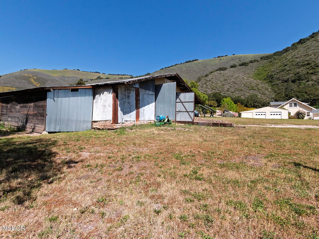 The image showcases a rustic barn, constructed primarily of weathered wood and corrugated metal. One side reveals peeling white paint and a combination of gray tones, blending into the natural landscape. Set against rolling hills, the barn’s slanted roof complements the rural aesthetics. The grassy terrain surrounding the structure is sparse, indicating a well-used area. Nearby, a hint of greenery from trees is visible, creating a natural frame. The open field leads to another building in the background, suggesting a broader homestead with a charming, countryside appeal. This scene epitomizes pastoral simplicity.