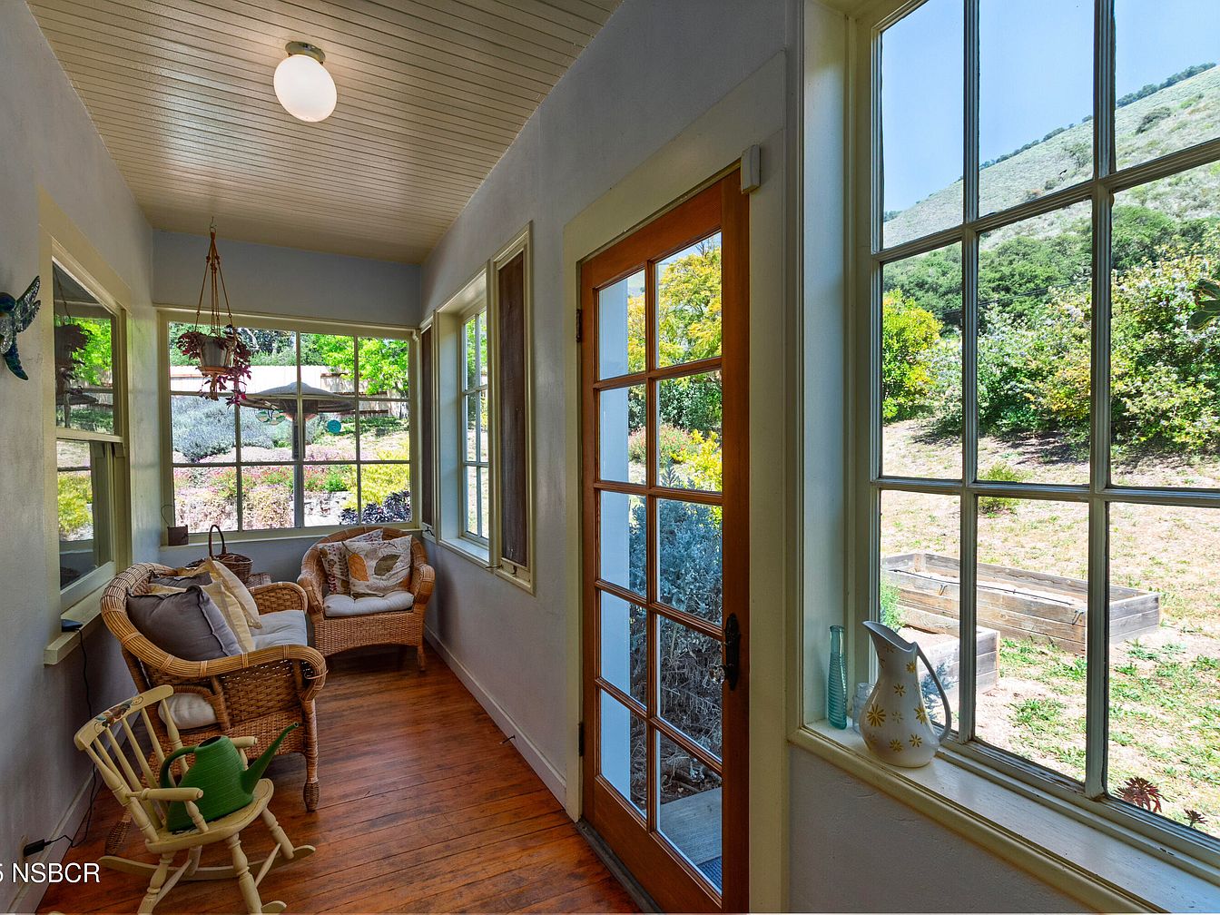 This sunroom features large, multi-paned windows flooding the space with natural light and offering views of the lush garden outside. A blend of earthy tones pervades the room, highlighted by warm wooden flooring and soft blue walls. A cozy wicker chair and a small table provide a welcoming seating area, adorned with plush cushions for comfort. A charming hanging plant adds a splash of green, complementing the outdoor scenery. The door, framed in wood, invites passage to the garden, enhancing the room’s connection to nature. Overall, the space exudes warmth and tranquility, perfect for relaxation.
