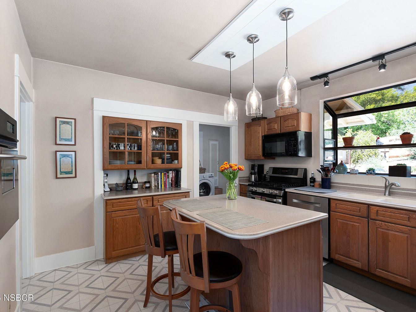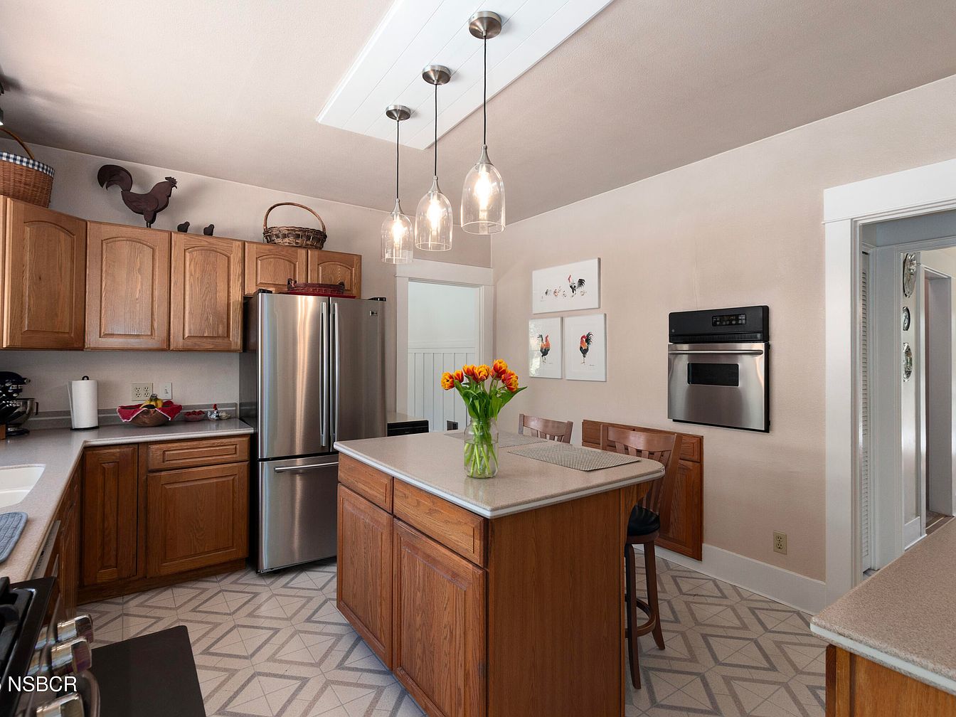 This kitchen features a central island with a modern aesthetic, complemented by warm wooden cabinetry. The light taupe walls create a soft backdrop, enhancing the natural textures of the oak cabinets. A row of three pendant lights hangs above the island, offering both function and style. The countertop is smooth, matching the floor’s geometric tile pattern, which adds a contemporary touch. Stainless steel appliances, including a French door refrigerator and built-in oven, provide a sleek contrast to the wood. Decorative elements, like baskets and rooster-themed art, introduce a charming, homey feel to the space.