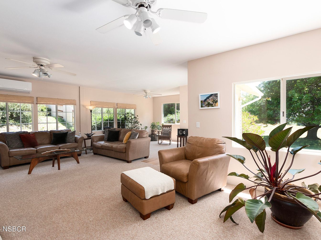 This spacious living room features a warm, inviting color palette of soft beige walls, complemented by plush carpeting. A large brown leather sofa adorned with colorful cushions provides a cozy seating area, accompanied by matching armchairs for added comfort. Natural light floods in from expansive windows and glass doors, enhancing the bright atmosphere. A sleek glass coffee table with wooden legs sits centrally, showcasing decorative accents. Potted plants add a touch of greenery, reinforcing the connection with nature. Ceiling fans gently circulate air, while framed artwork embellishes the walls, creating a harmonious blend of aesthetics and functionality.