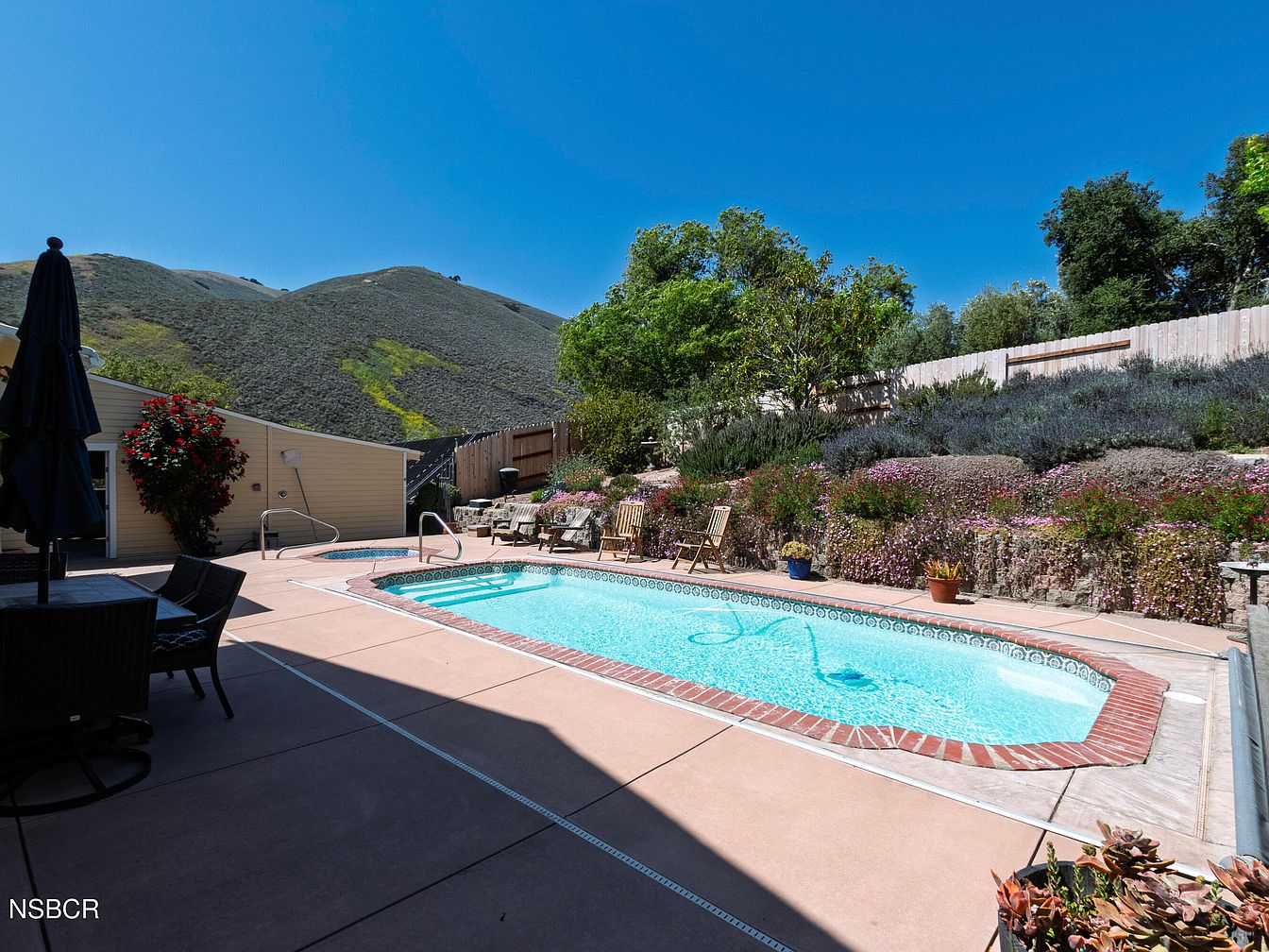 The outdoor pool area features a refreshing blue swimming pool bordered by brickwork. Surrounding the pool are paved surfaces, creating a spacious layout ideal for relaxation. A mix of wooden lounge chairs and a dining set enhances comfort while enjoying the sunny atmosphere. Colorful landscaped flowers and shrubs rise on a sloped hill behind, adding vibrant greens and purples to the scene. A large umbrella provides shade for seating, while the clear blue sky and mountain backdrop further emphasize the serene, inviting ambiance of this outdoor retreat.