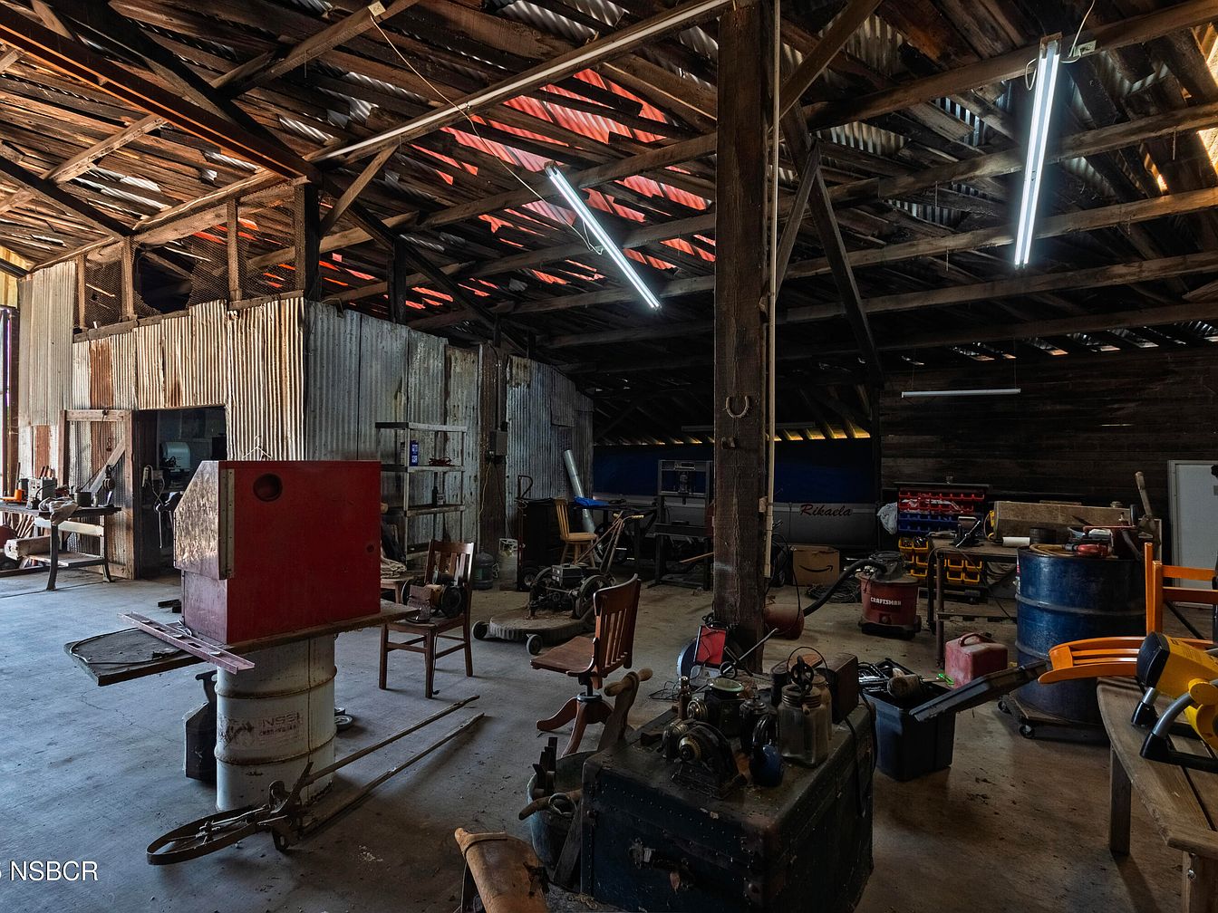 This workshop showcases a rustic, utilitarian aesthetic with exposed corrugated metal walls and a wooden beam ceiling. The lighting is provided by fluorescent strips, casting a bright glow over the space. Inside, a sturdy workbench against the back wall hosts various tools and materials, while a metal shelving unit holds equipment and supplies. The concrete floor, worn and textured, adds to the industrial charm, contrasting with the open doorway leading to vibrant greenery outside. The view reveals rolling hills and rich vegetation, creating a serene backdrop that enhances the workshop’s functionality.