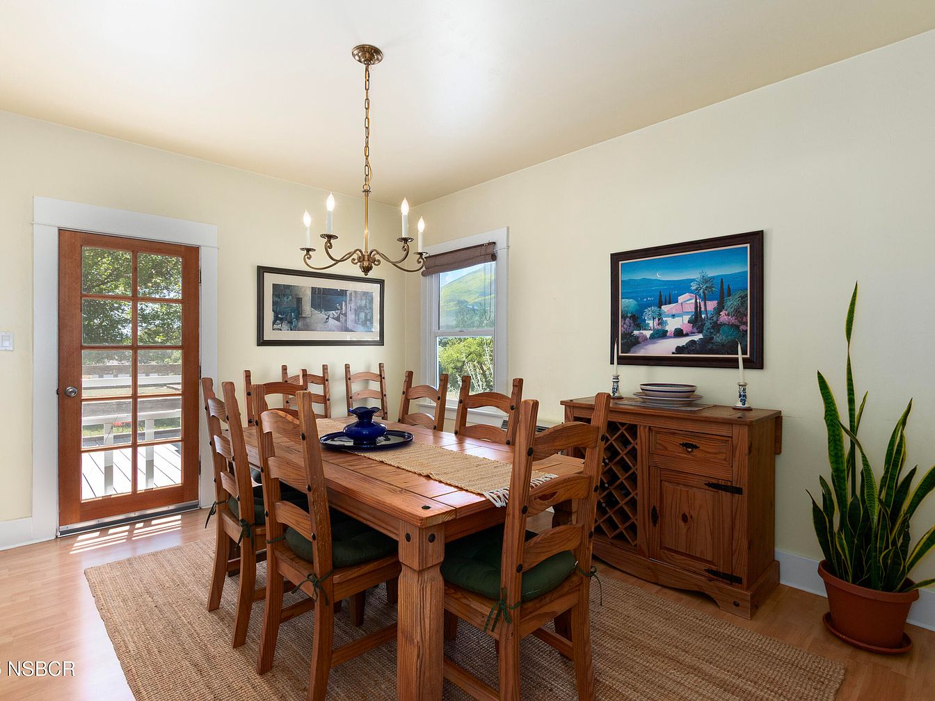 This dining room features a robust wooden table surrounded by matching chairs, each adorned with green cushions. A woven placemat lies across the table, enhancing its rustic charm. Natural light pours in through a French door, contrasting against the soft yellow walls. The chandelier, with its warm, illuminated bulbs, hangs gracefully from the ceiling, adding elegance. A sideboard showcases decorative plates and a wine rack, enhancing functionality. An artwork depicting a serene landscape adds a splash of color above the sideboard. The room’s design is complemented by a potted snake plant, which introduces a touch of greenery.