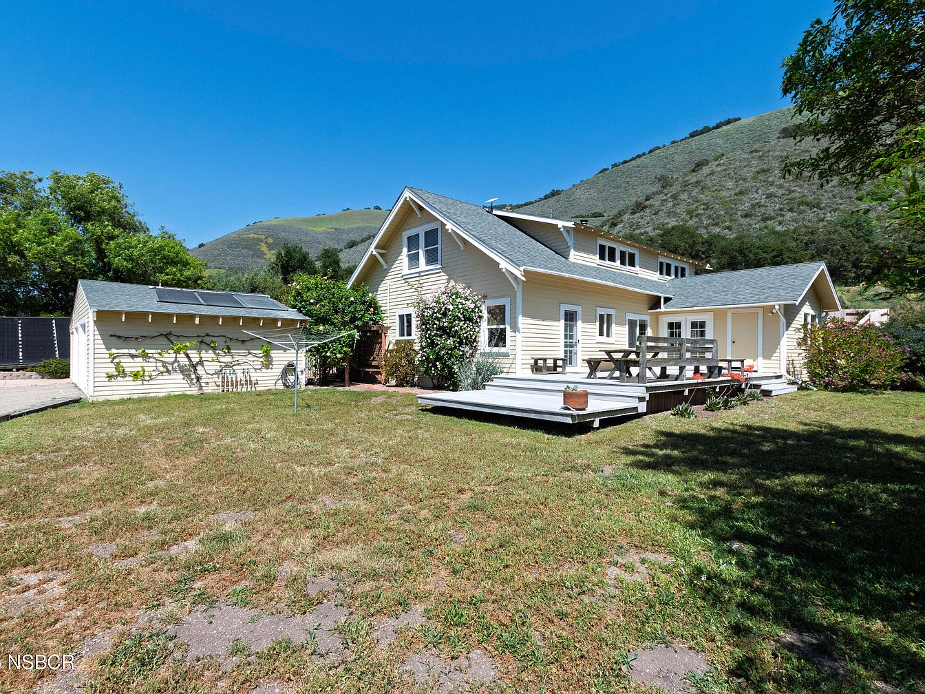 A picturesque view of the exterior of a historic American home surrounded by lush greenery and scenic hills. The house features a light yellow exterior with white trim, exuding a charming and inviting ambiance. A wooden deck area extends from the side, presenting outdoor seating perfect for relaxation. The adjacent outbuilding boasts a sloped roof and solar panels, aligning with sustainability. A neatly manicured lawn stretches across the foreground, dotted with colorful flowering shrubs. Directly behind, rolling hills create a stunning backdrop, enhancing the tranquil setting, perfect for outdoor activities and gatherings.