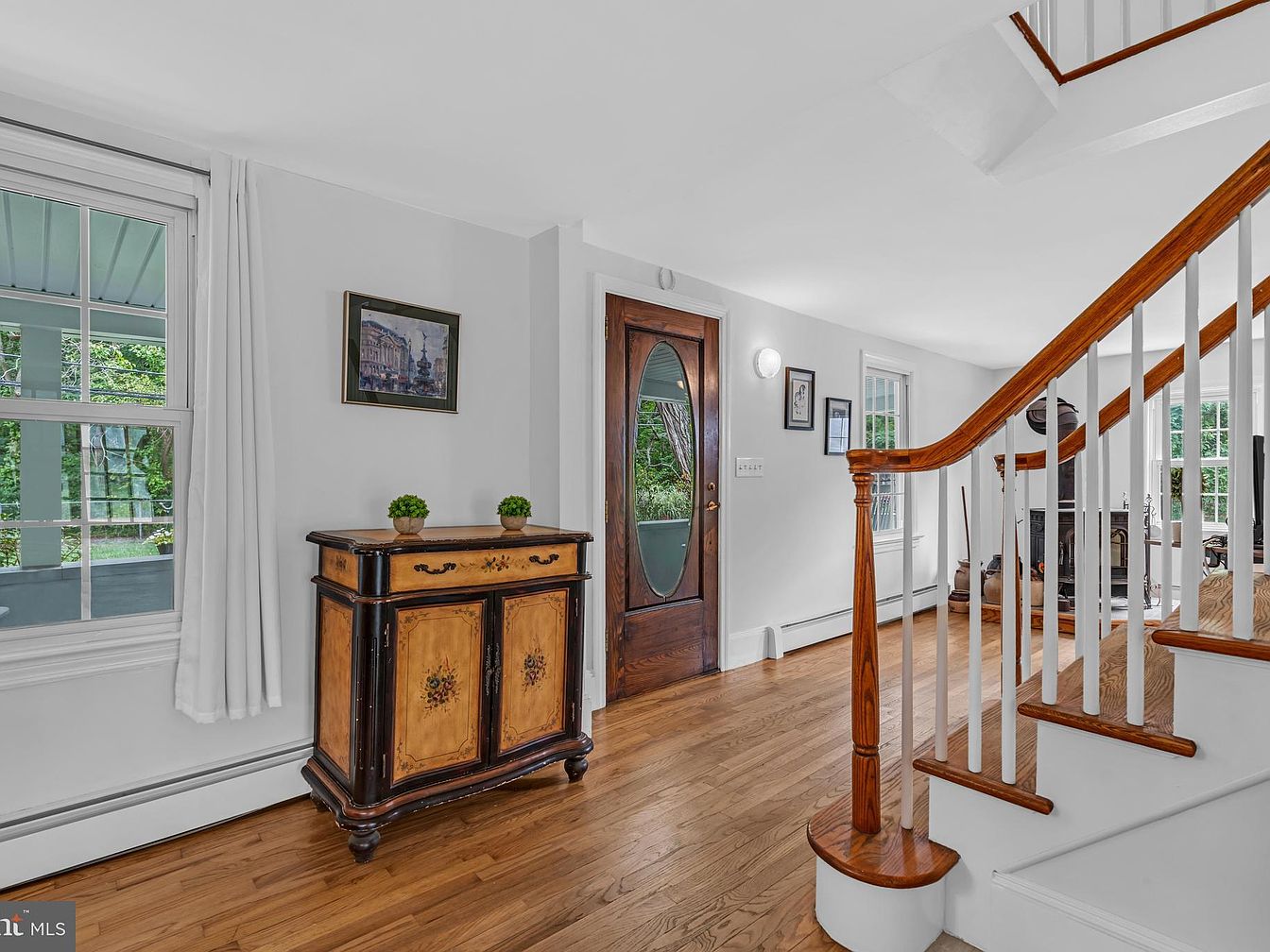 This entryway features an inviting layout, seamlessly connecting to a staircase on the right. The walls are painted in a soft white, enhancing the natural light streaming in through large windows, revealing a lush outdoor view. A vintage black and golden cabinet stands on the left, adorned with delicate floral designs, adding a touch of character. Above, a small framed artwork complements the nostalgic ambiance, while a pair of potted plants bring a hint of greenery. The elegant front door showcases a round glass panel, merging traditional elements with modern comfort in this welcoming space.